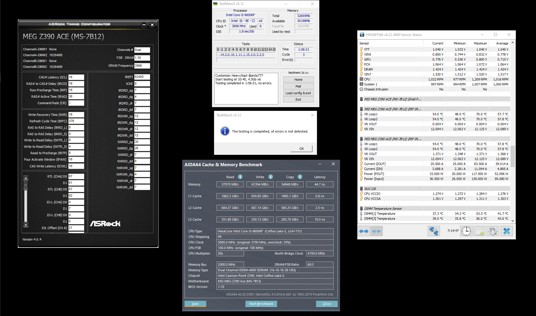 Изначально пробовал разгон методом научного тыка не читав эту тему (все вторичные тайминги на авто, вольтажи на авто), удалось достичь частоты 4000 с таймингами 17-20-20-38-2, но все вторичные были очень далеки от идеала. Аида ошибок не находила, но в играх были фризы и лаги. В итоге проверился TM5 получив около 30 ошибок за 5 минут, начал крутить тайминги чуть выше, в итоге система перестала грузиться. Решил что такой метод не подходит и приступил к разгону с нуля, гнал по миксу простой таблицы от anta777 и универсального гайда от agiliter прилагаю скрины первого результата + скрин всех прог и теста с нынешним состоянием оперативки