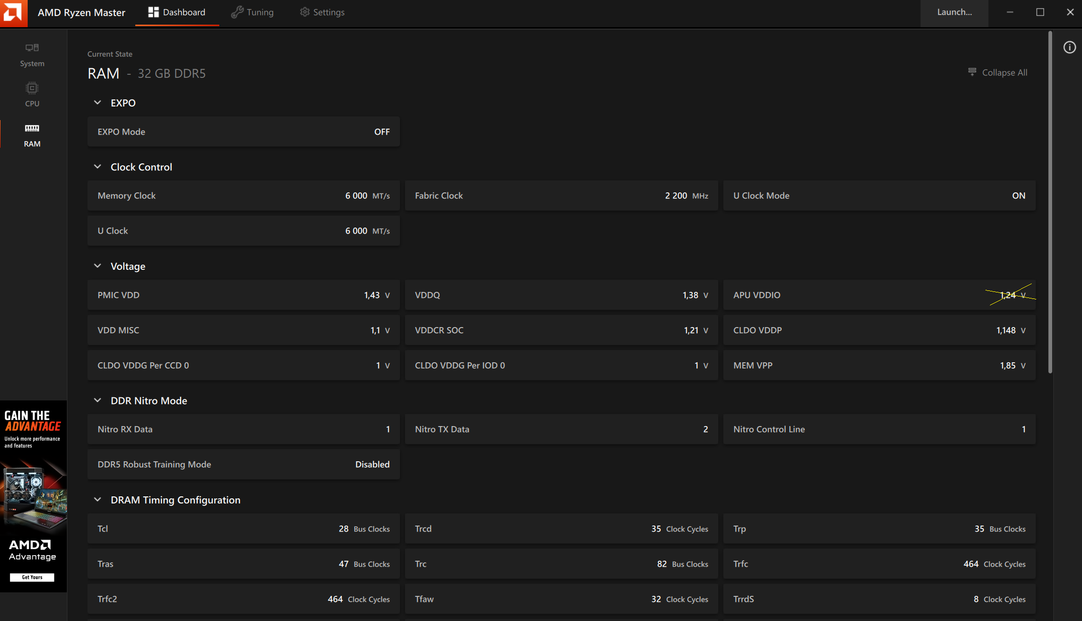 Привет, кто то может подсказать, сколько VDDIO у автора скриншота? ZenTiming багует Хотел бы попробовать взять напряжение для таких же таймингов, мои попытки заканчиваются ошибкой в fftv4 #77 Буду признателен