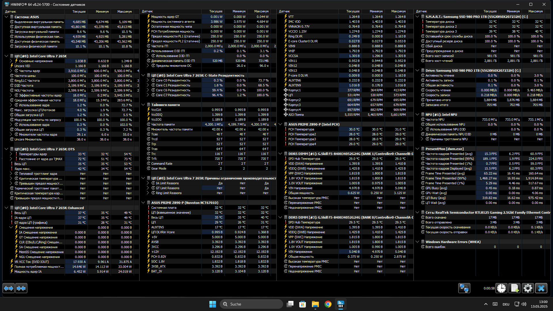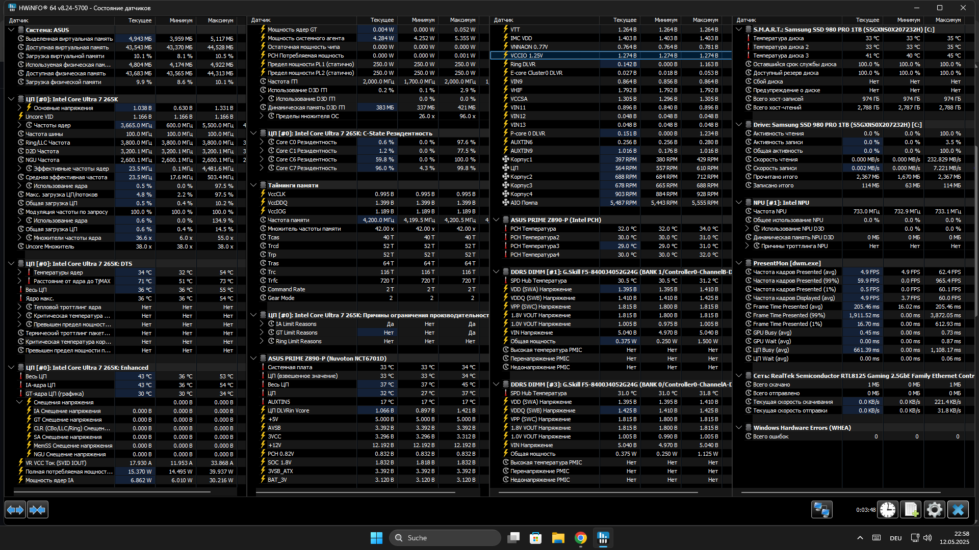 Приветствую. Поставил Arrow Lake на базе материнки Z890 Strix-A. Смотрю температуры при игре в КП77 и вижу, что память греется до 53-55 градусов. Обдува памяти нет, корпус огромный, продуваемый, 3 вентилятора на вдув и один на выдув. Такая температура нормально? При тесте anta777 Intel DDR5 уходит до 61 градуса. Настройки памяти прилагаю. Я немного снял разгон. Прилагаю скриншот Timing Configurator