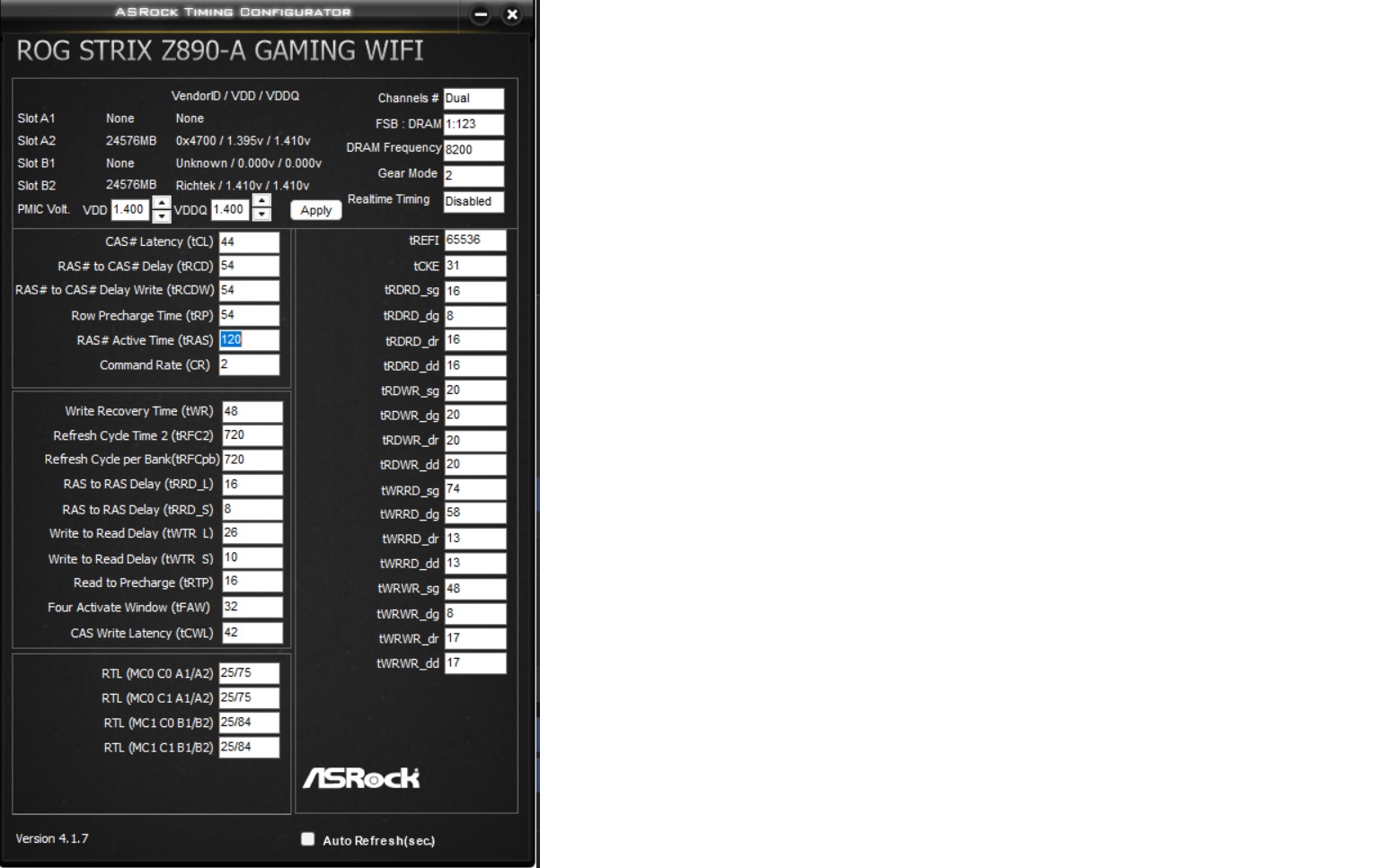 Попробуйте vddQ памяти снизить до 1.3 или 1.35, в идеале оно должно быть ниже vdd на 100-200 т.е. у вас vdd/q 1.395/1.295 например. У меня установлено 1.45/q1.36, но у меня память в хмр 1.45/1.45. Может поможет. Если не стартует, то постепенно поднимайте.