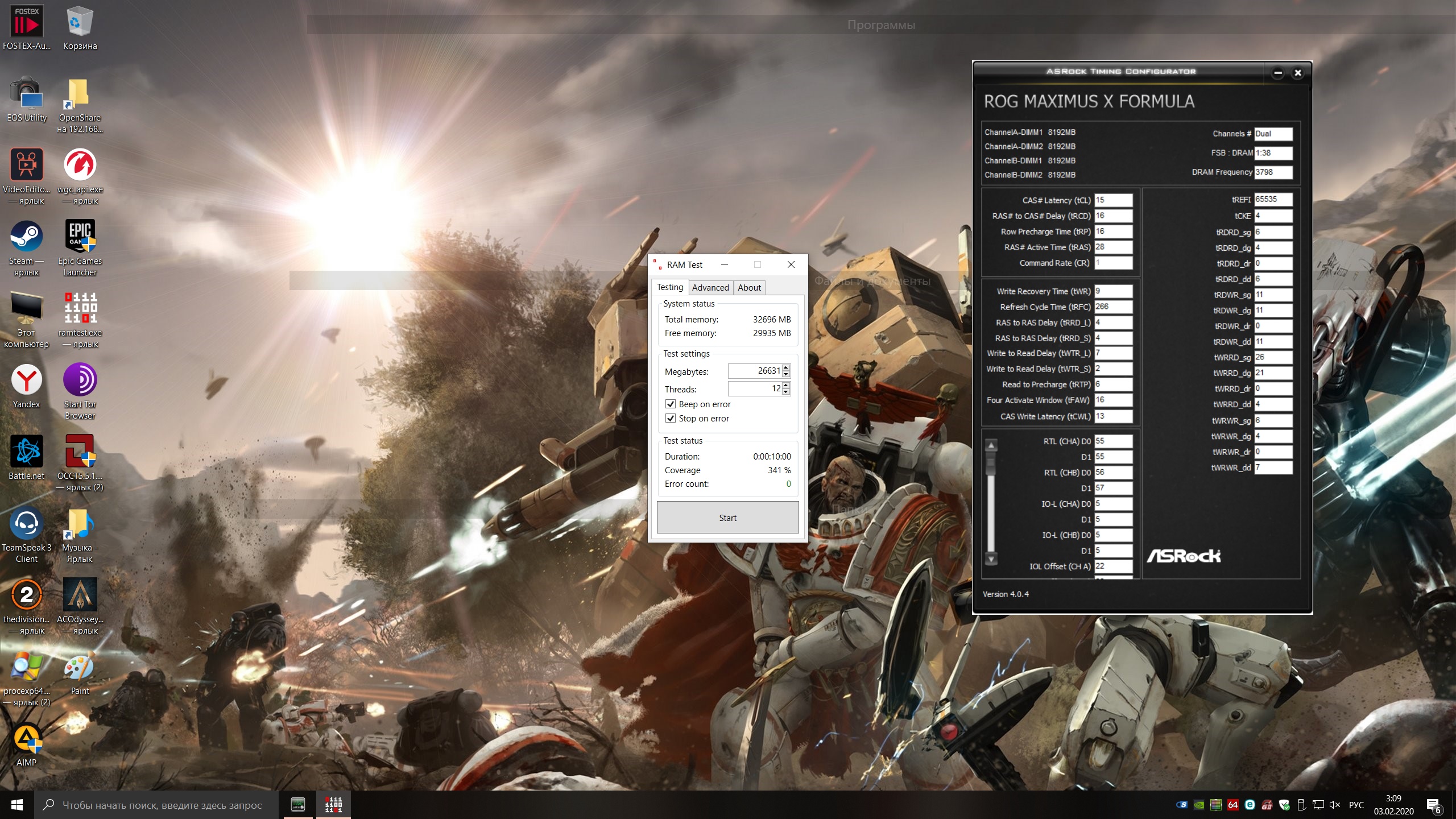 антиовер был прав, сегодня, во время игры пошли артефакты в игре, а ни какие мемтесты ни одной ошибки при проверке не показывали. поставил FAW=16, CKE=8, думаю, что какой то из этих таймингов и виновен в этом, к тому же долго парился с частотой 2933 так как там у меня шли RP, RCD=16 на этой частоте и долго не мог понять что за фигня, все нормально работает, а иногда (обычно тогда когда включаешь только комп когда он холодный) синие экраны появляются, все тесты проходило (экстрим и 2020лоу), а 2020хай бывало 1 ошибку выбивал, но не всегда, то выбьет, то нет, так вот благодаря таблице таймингов ввел в ней ту частоту, на которой моя память работала стабильно с теми же таймингами (3200 16-18-18) и благодаря этой таблице увидел, что мои плашки чтобы работали на таймингах RP, RCD=16 нужно выставить частоту 2800 максимально, поставил, чуток перенастроил тайминги и теперь опять тестирую, все проходил без ошибок, время покажет!