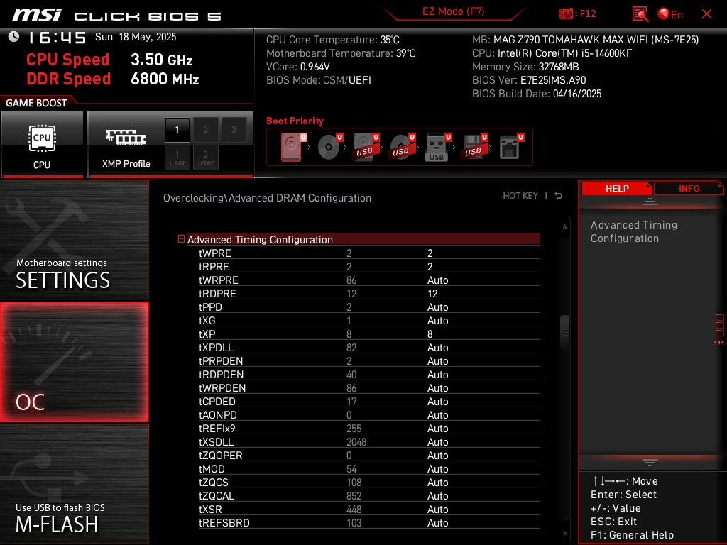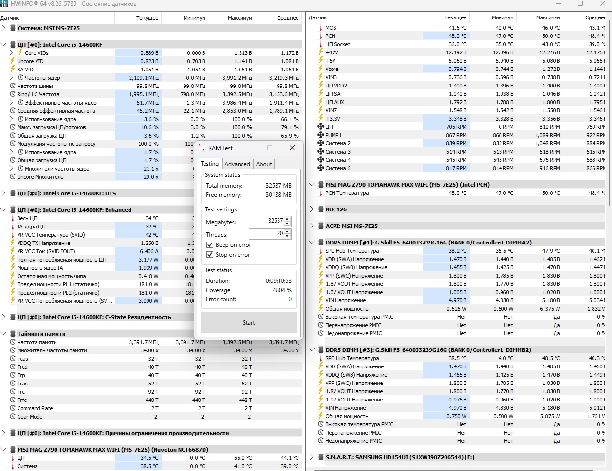 PU SA Voltage=1.05 CPU VDDQ Voltage=1.25 CPU VDD2 Voltage=1.4 DRAM Voltage=1.47 DRAM VDDQ Voltage=1.45 с этим питанием на 6800 32-40-40-40-52 тест karhu проходит 9 часов с макс.темп 48С.