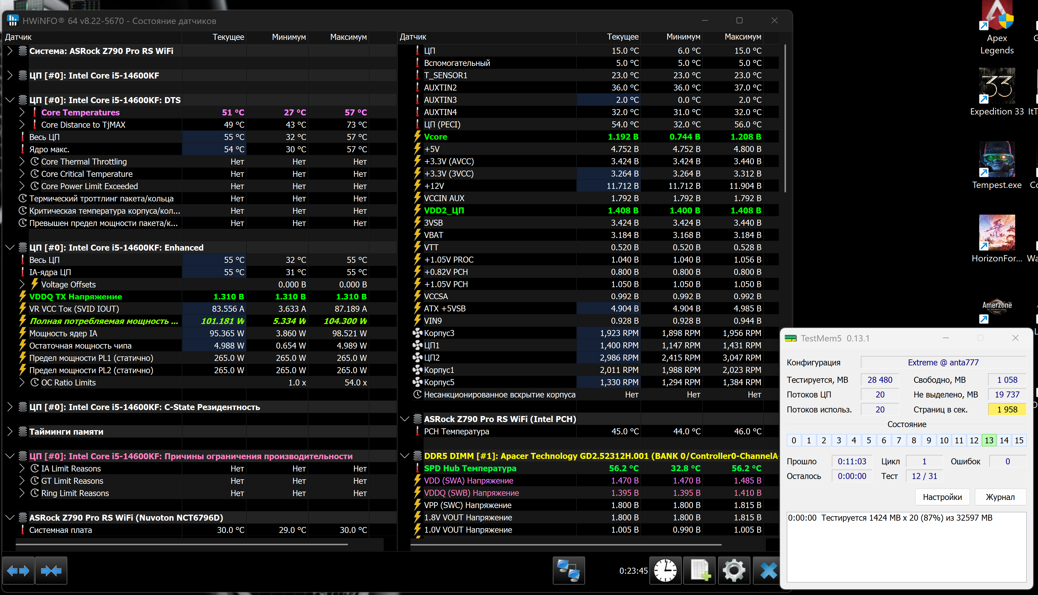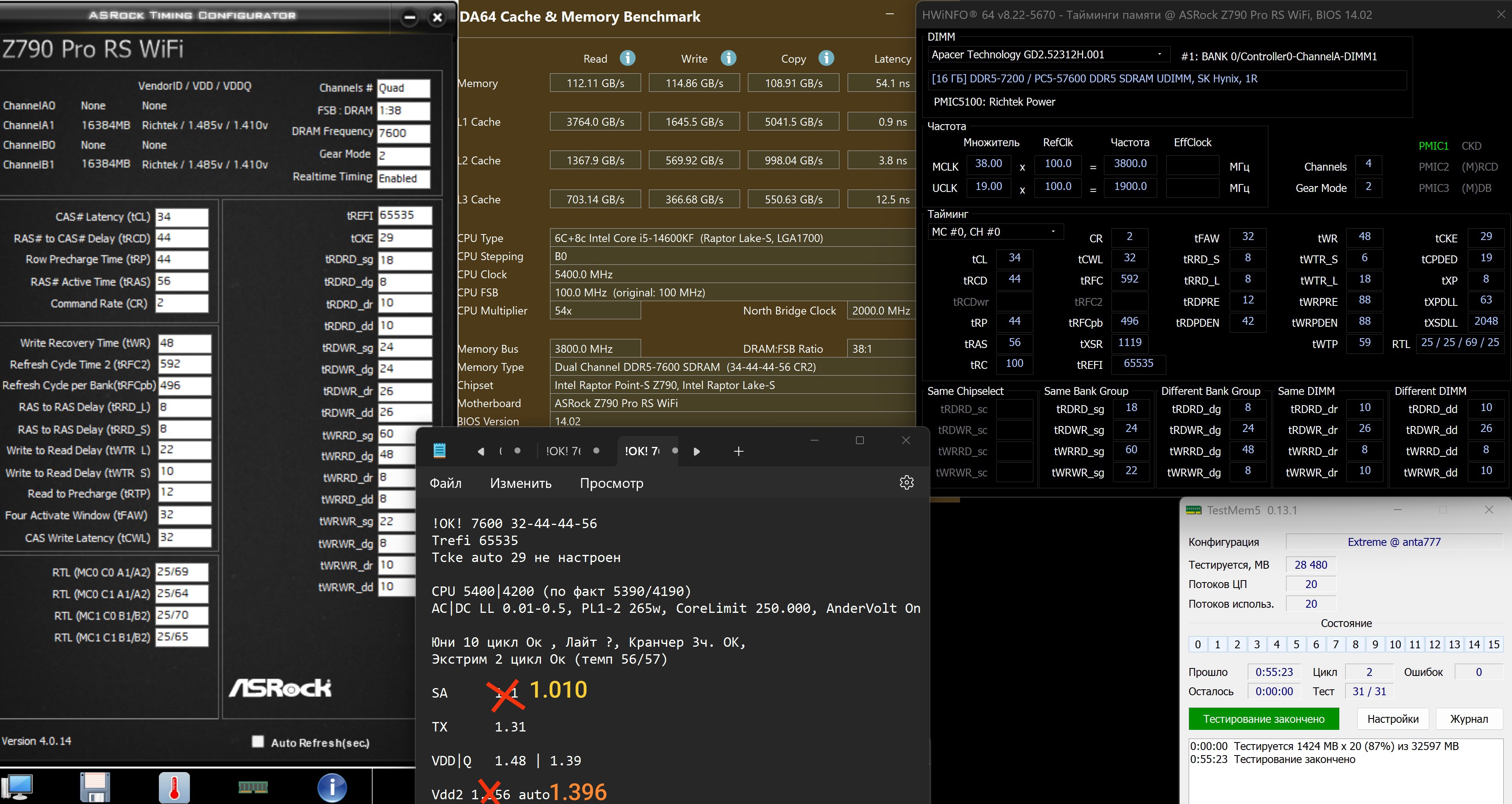 Не пойму где логика, сегодня уезжал 1. поставил кранчер VT3 на 3ч с хмр (7200 43-42-84, трефи 7К, вдд.к 1.45-1.45, тх 1.45, са 1.1. вдд2 1.396; срu 5400/4200) Приехал тест пройден 2. Поставил опять кранчера но на 7600 34-44-56 (трефи 65к) тх оставил 1.45, вдд2 и Са не трогал, остальное изменил вдд.к 1.48-1.39. Сразу ошибка на 1вом проходе, снизил Тх до 1.43 тест попер. Приехал 3ч кранчер Ок. Запустил экстрим и одна ошибка 3. Далее, опять на 7600, напруги оставил как есть, только снизил тх до 1.3. Опять кранчер пройден 3ч. Экстрим не запускал, юниверсал и мелочь проходят + Осст 20мин цп+ддр.