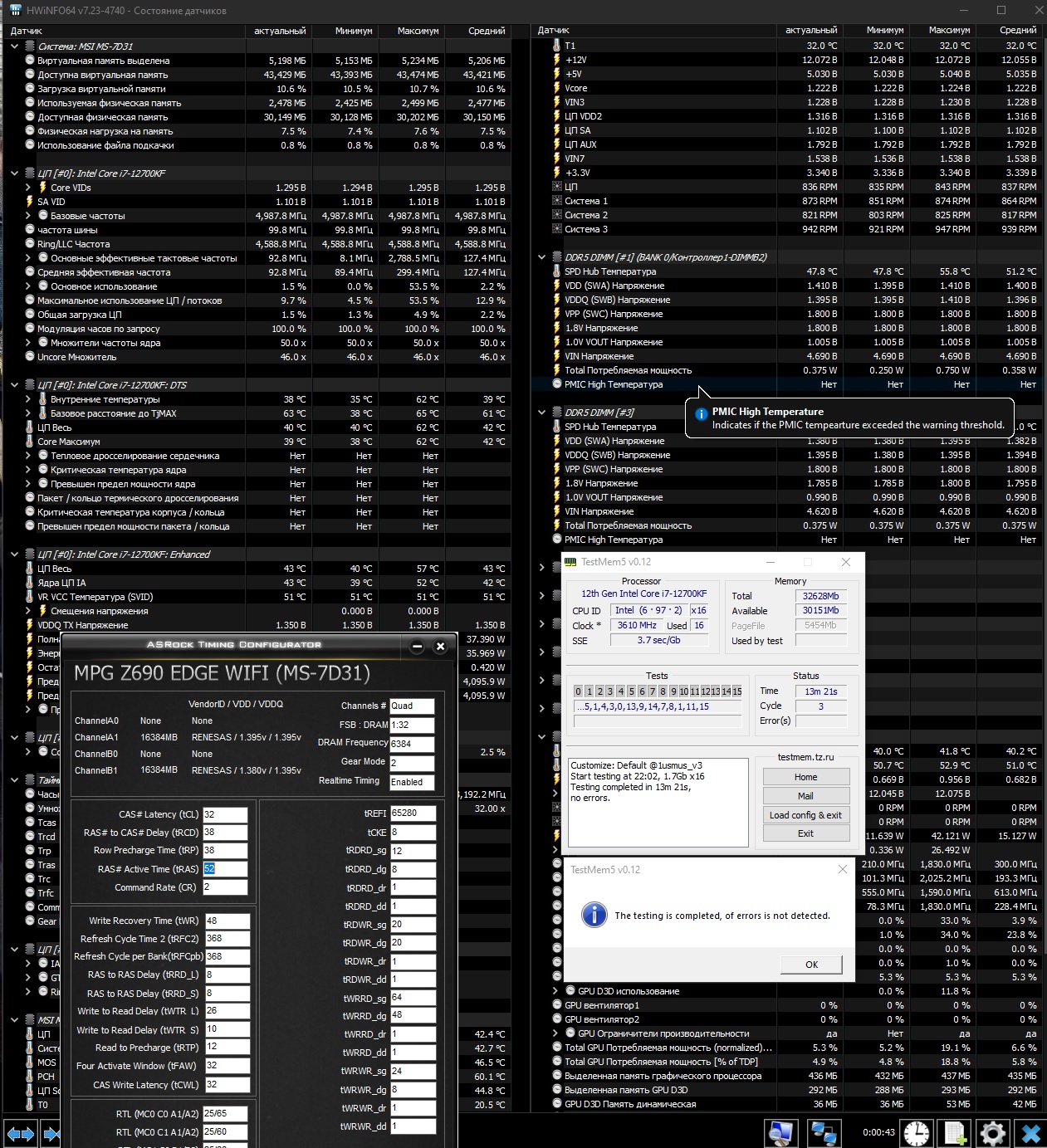 Память эта должна уметь 6000 мегагерц в XMP на cl40@1.35V, но XMP с процессором без буквы К не работает. При проставлении вручную этого вольтажа и таймингов система не стартует, при выборе ХМР - тоже, пришлось ставить вручную, материнка это позволяет и без к-проца Смог запустить на частоте 5400Мгц с таймингами 36-36-36-76 с вольтажом 1,25, при этом мемтест без ошибок. Запускается и на таймингах 32-32-32-63, но сыпет ошибками. Хороший ли это результат?