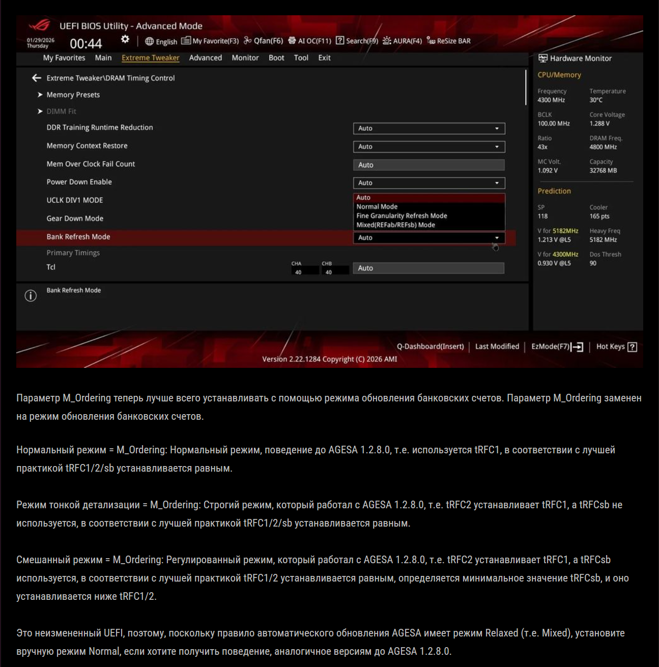С AGESA 1.2.8.0 появился новый пункт в биос, у Asus он сейчас называется Bank Refresh Mode (ранее M_Ordering). В нём есть три режима: Normal Mode ранее работавший по умолчанию и требовавший активным только tRFC1, Fine Granularity Refresh Mode и Mixed Mode который теперь стоит по умолчанию в последних биосах начиная с выше упомянутой AGESA и требующий активных tRFC2 и tRFCsb.
