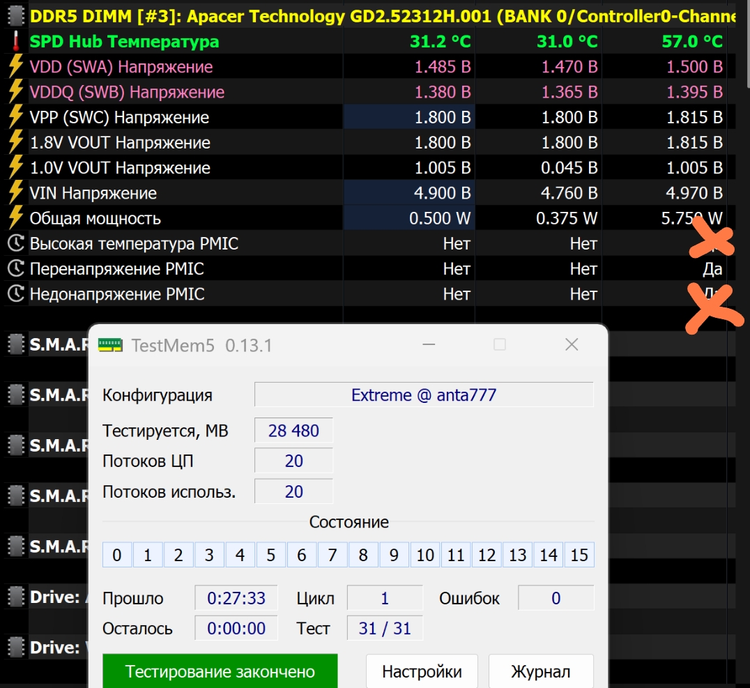 Скрин не сделал, просто прогнал экстрим 2 круга Ok, по результатам в HW запись в разделе ddr, строка Перенапряжение Pmic, графа max - Да. Как на скрине почти, там где крестики - этого нет уже.