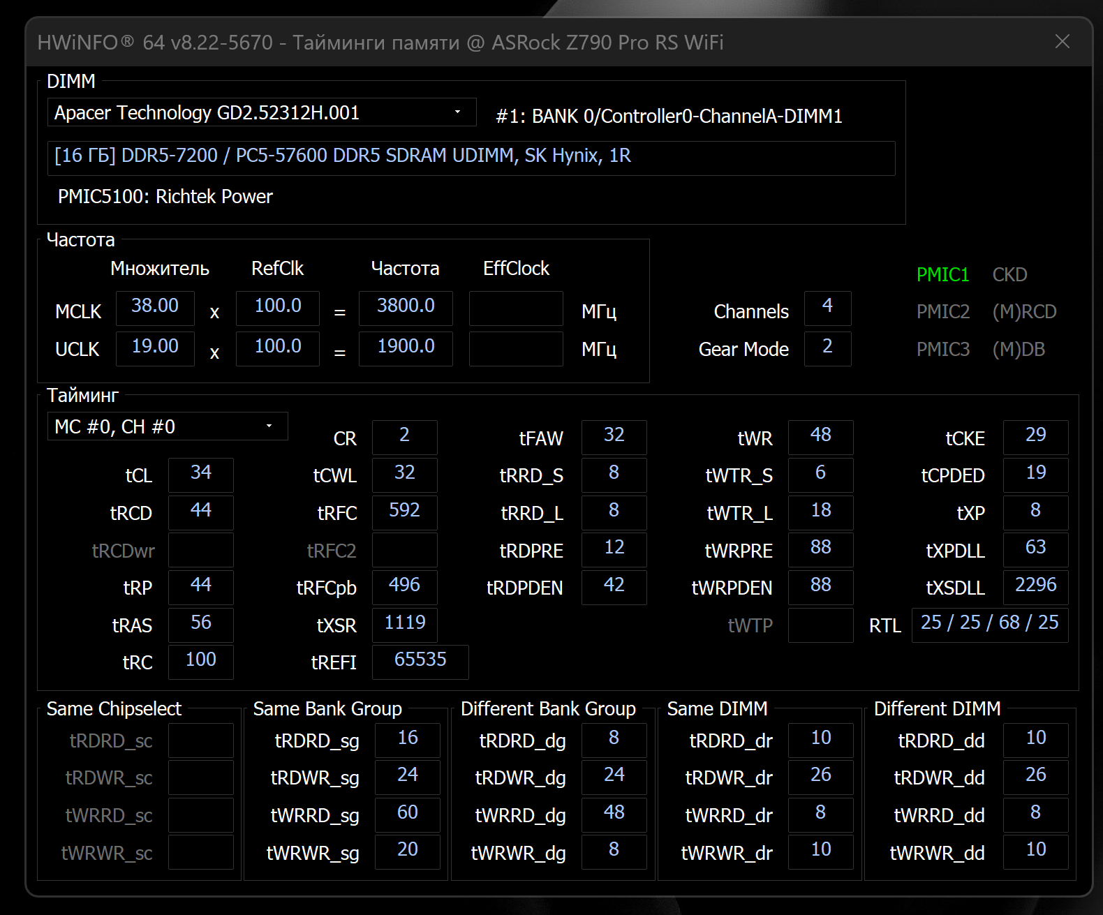 У меня комплект почти как у вас, (Apacher AH5U32G68C642MBAA-2) на днях урвал в Регарде за 7999₽ =) Предварительно тыркнул, и получилось вот что: 7200 34-42-42-80 CR2, это полная стабильность. Так то и на 8000 грузится без проблем. SA 1.150 Память не любит напругу выше чем 1.30, так что ограничился ею. Максимальная стабильность на дефолтной частоте (6800) достигается вообще при 1.2, а 7200 (без сабов) при 1.25, с тем что на скрине - при 1.29-1.30. TREFI 130560 (131070 ещё не тестил) робит только в CR2, в CR1 может только с TREFI 32535
