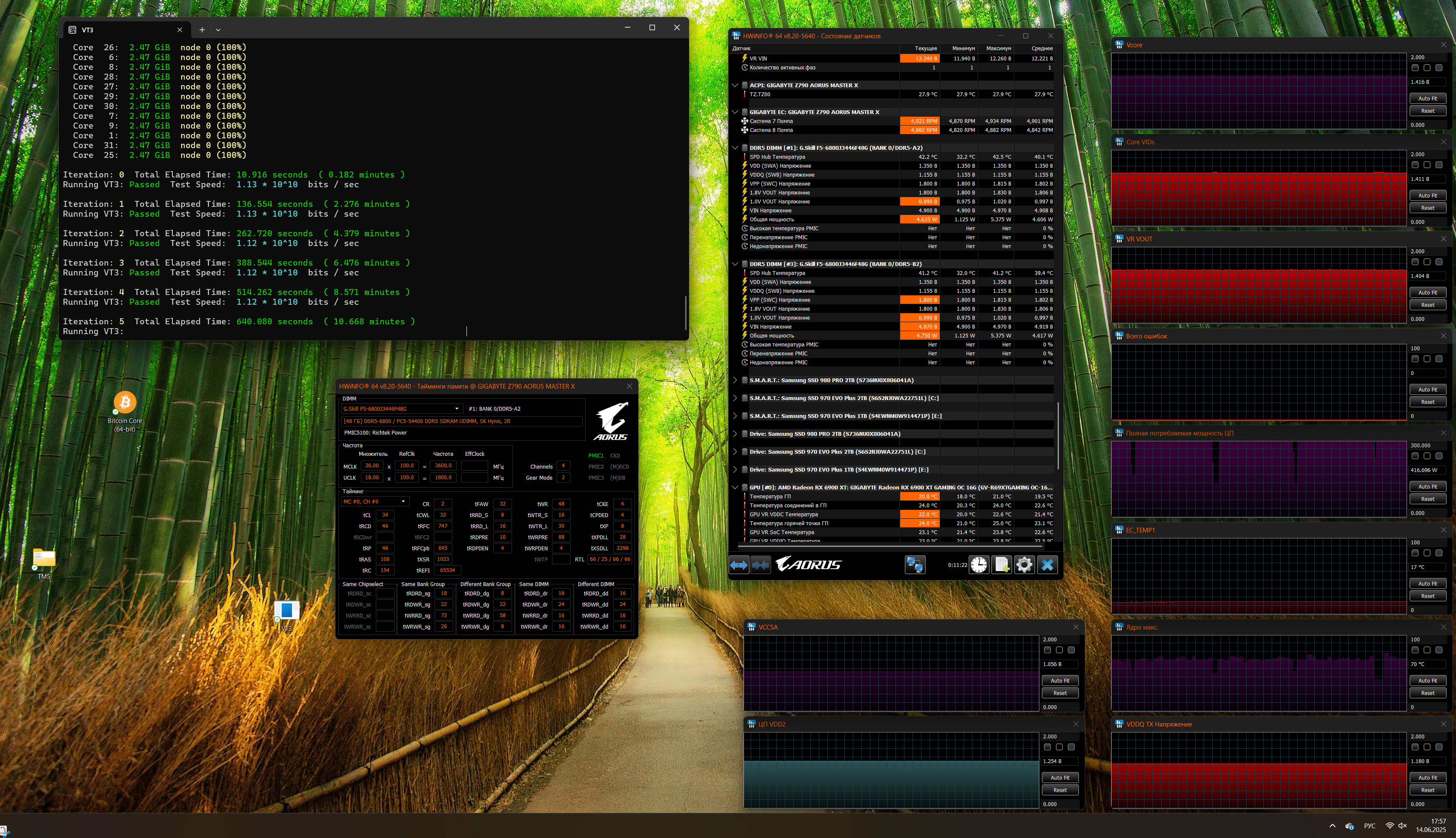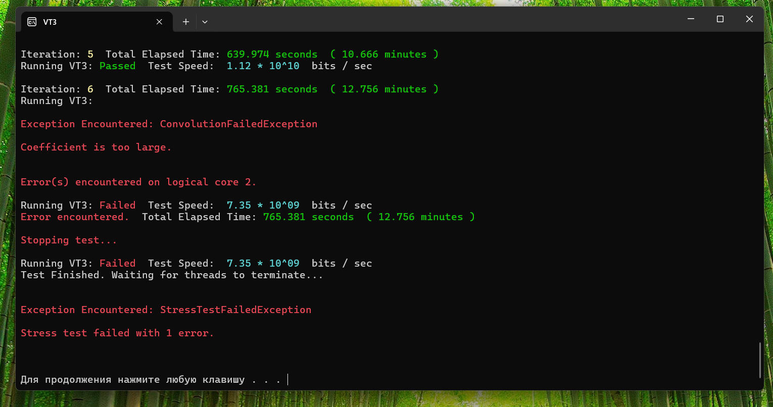 Мой выбор тестов для DDR5: 1. RamTest Pro (находит для меня ошибки по vddq tx/vdd2 быстрее даже, чем vt3 тот же...); 2. y-Cruncher (не только VT3, а все тесты); 3. TM5 0.13.1; 4. Karhu.