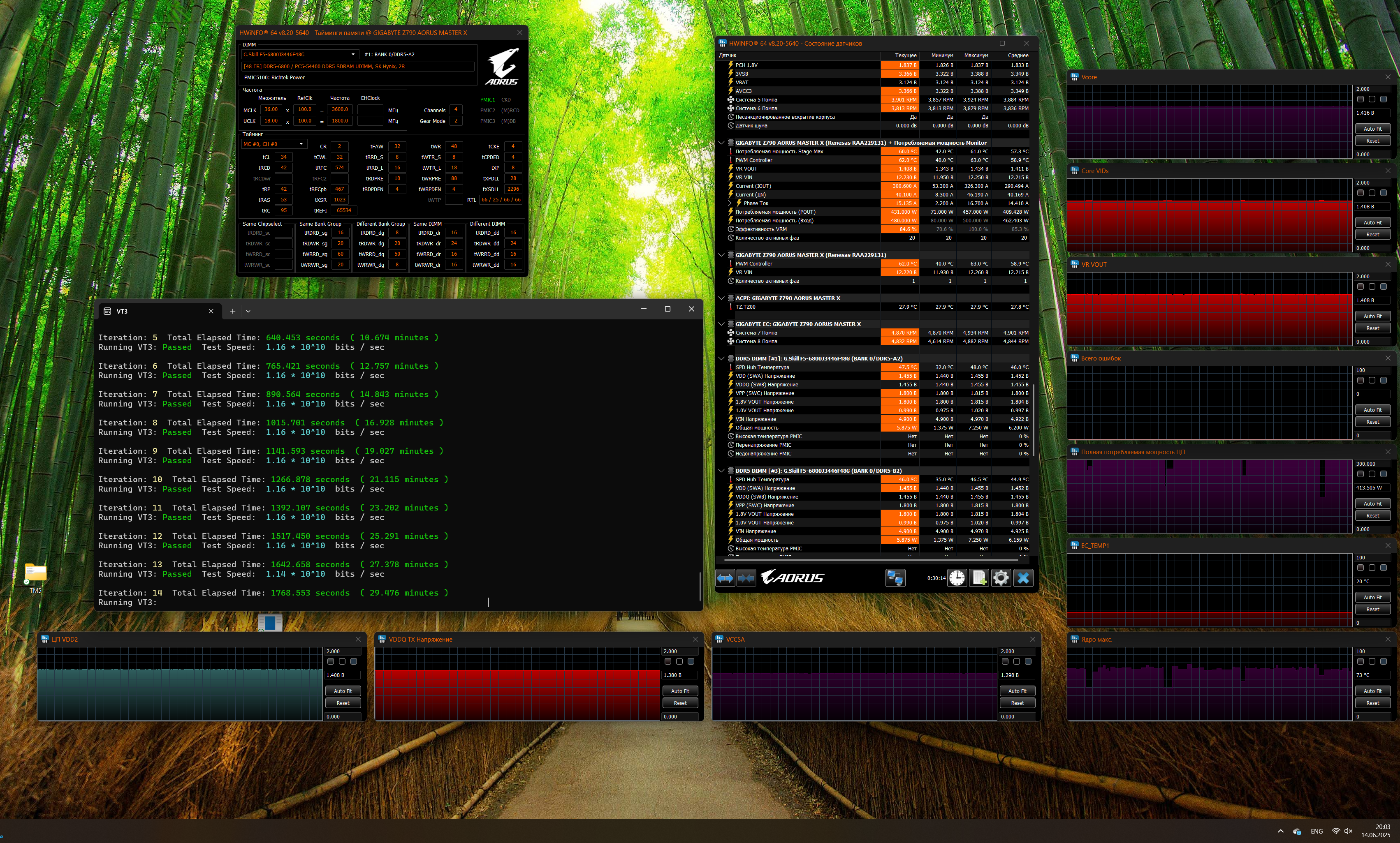 P.S. На 7200 пока что тренировочный рандом вернулся. Может пройти десять раз VT3, потом не пройти ни одного, потом пройти три и подобное) Но есть подозрение, что нужно дать чуть больше напруги на контроллер памяти, чтобы побороть этот эффект. Ибо тренировка на 1.25 tx / 1.3 vdd2 проходит на порядок быстрее, хоть и глючит потом. Подбирать всё заново…