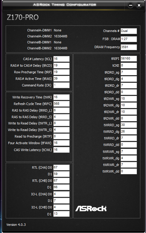 Dram voltage 1.43v Vccio 1.25v Vccsa 1.25v Mrc fastboot disabled Asus memory scrambler disabled Full check enabled все тайминги с _dr в окончании пока в авто в третичных Весь раздел rtl iol в авто Параметр rtl init = 67 Trdrd_sg = 6 и twrwr_sg = 6 F10 и в биос Tcke = 4 F10 и в винду Скрин таймингов сюда