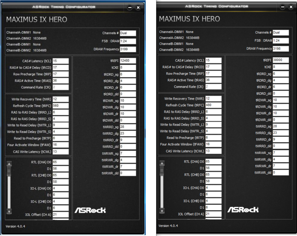 Начните с RCD, CL. Не обязательно должны быть одинаковыми, обычно CL идёт меньше чем RCD. RAS сразу пробуйте как RCD+CL+4, до этого значения от него существенная разница, дальше меньше. CWL<=CL. Допустимые значения 9,10,11,12,14,16,18,20. RP можете выставить по RCD, если пойдёт меньше - тоже неплохо, не уверен правда насчёт смысла. RTP без формул. Если не идёт вниз можно попробовать поднять чуть чуть RP. В DDR4 явно связан с WR соотношением 2 к 1 (например WR20\RTP10), физически хранится одно значения и в зависимости от операции интерпретируется. Скрутите FAW до 16(так и оставьте если работает). С таким FAW скручивайте RRD(оба, L обычно больше чем S), возможно поедут на 4 оба. Если до 4 не удалось спустить поднимите FAW до уровня RRDL*4 и попробуйте ещё, хотя это скорее всего уже почти предел. Обычно L>=S. L - SG(Same Group). S - DG(Different Group) Напр. RRD_L>=RRD_S. CKE=5 СCDL>=4 RDRD_DD и прочие подобные можно проигнорировать если у вас нет двух планок на один канал (4 планки). DD-Different Dimm. Тоже самое с DR-Different Rank если у вас одноранговая память. RDWR_SG(DG) и подобные сочетания скручивайте до минимальных рабочих, потом накиньте сверху +2. Как уже отметил обычно SG>=DG. WTR не трогайте он сам спустится когда будете скидывать WRRD_SG(DG) и прочие подобные. Если сам меньше не стал тогда руками скидывать. WR снижать через WRPRE если есть. Если нет или не снижает WR, То скрутите его скажем до 12 или +4 от рабочего, потом дожмёте если не лень будет. RFC явных формул нет, крутить после всего списка сверху. Не пытайтесь найти его минимальное значение если не хотите чтобы память начинала сыпать ошибками от любого чиха. найдите пограничное со стабильностью значение и накиньте сверху 20 или сразу 40. Может реагировать на RAS+RP, RRD, FAW, причём в обе стороны (то есть может "сломаться" если задрать названные), а может и не реагировать... REFi больше лучше. Связан с RFC. REFI сколько память "работает" - RFC сколько "отдыхает". Оба тайминга лучше не пытаться найти предельное значение.Заметно реагируют на температуру. Многие тайминги отзываются и на температуру и на напряжение. Поскольку напряжение может как позволить снизить тайминг, так и увеличить температуру, то середину можно искать очень долго, поэтому лучше бы вовремя остановится. Тестируйте тщательно с перезагрузками, сном, холодным стартом. RTL и IOL вам кто-то другой пусть советует как настраивать, от них у меня голова болеть начинает...