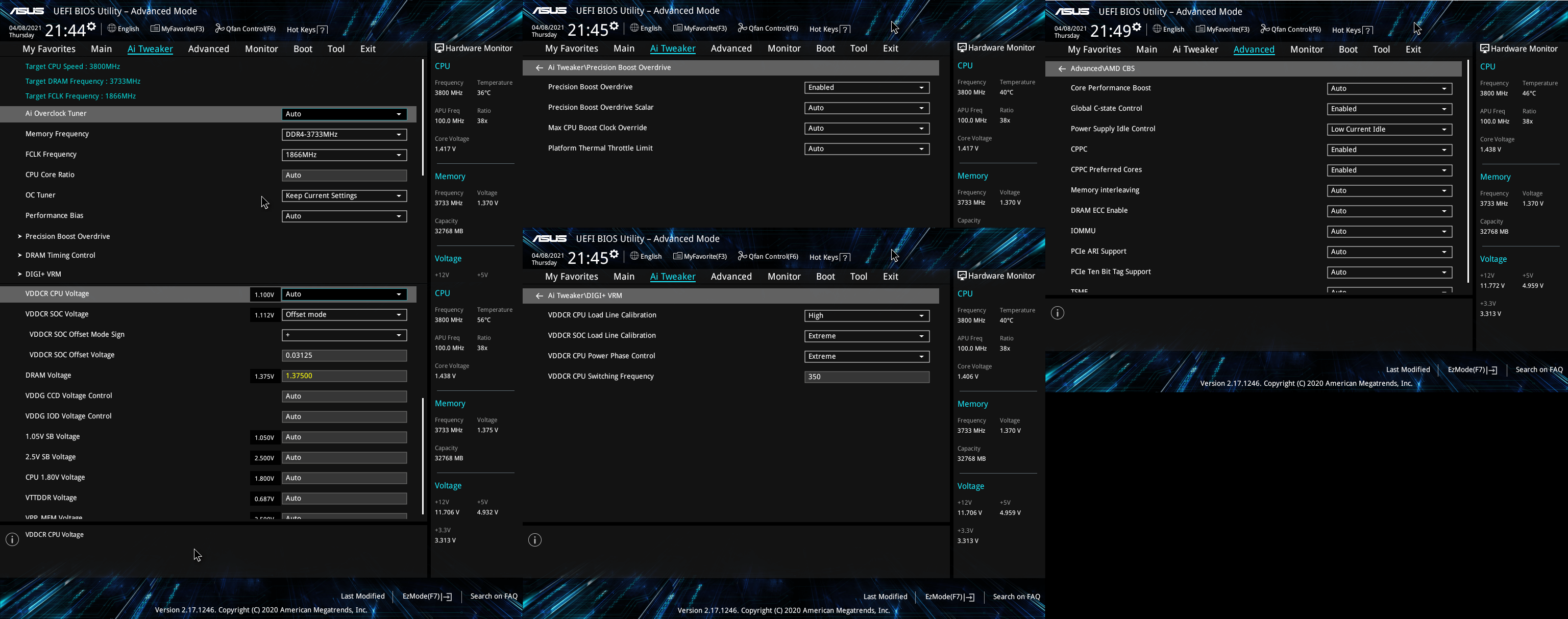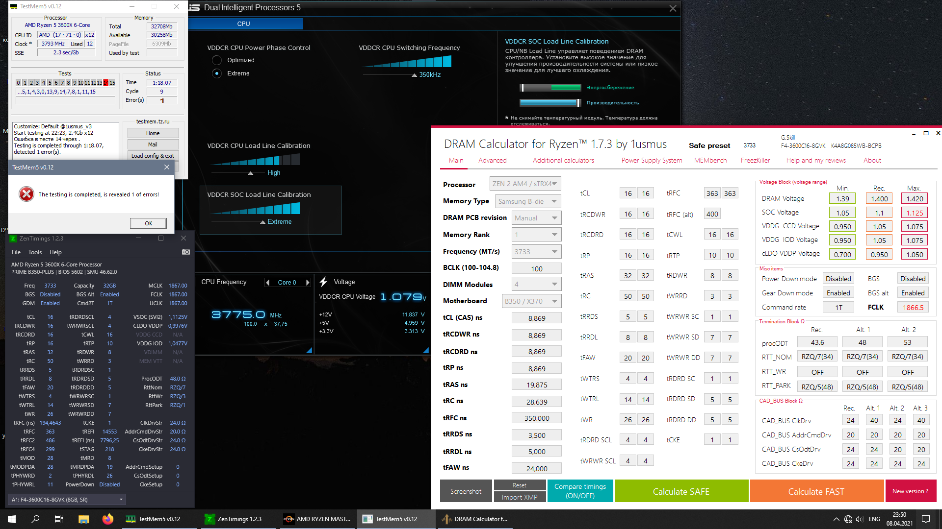 Прошу помощи со стабилизацией разгона памяти на 3733 МГц. Система в целом практически стабильна, но ловлю редкие ошибки в TestMem5 (с конфигом 1usmus_v3), стресс-тест AIDA64 завершается с ошибкой спустя несколько минут, Prime95 также останавливается по нескольким worker'ам.