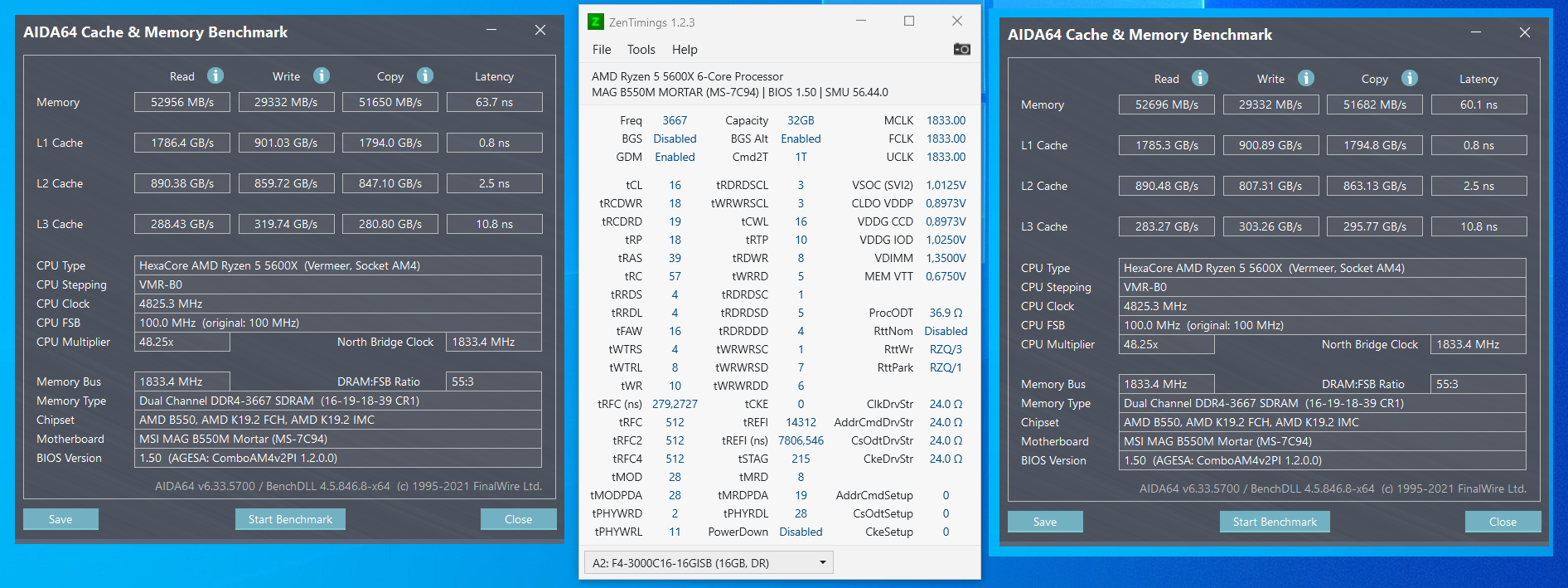 добрый день, имеются два модуля g.skill aegis 16 gb (f4-3000c16d-32gisb, определить производителя не получается) c xmp профилем 3000@16-18-18-38, удалось завести на 3666 Мгц со странноватыми первичными таймингами, есть что улучшить? латенси колеблется 61-64 (с минимальным фоновым окружением)