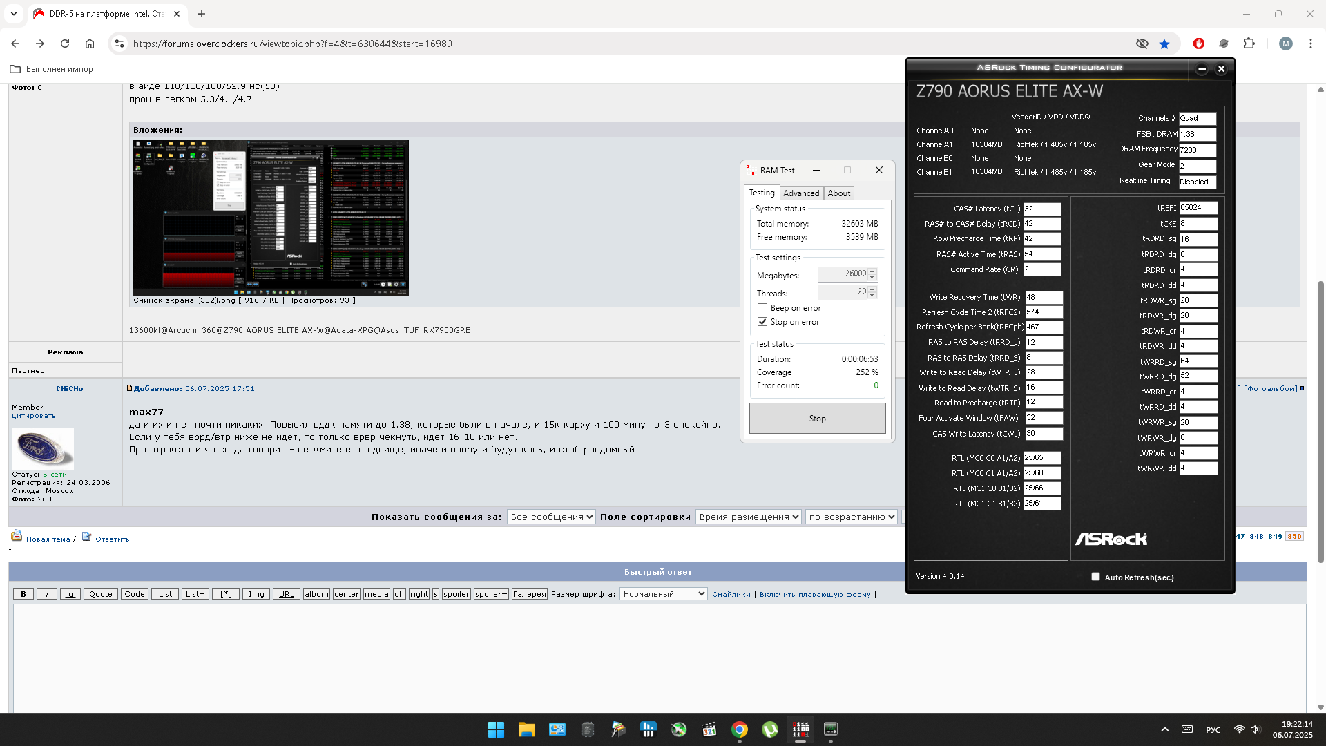 Народ, нужен совет. Имеется двухслотовая материнка MSI Z790MPower и память 2 х 24 F5-8000J4048F24GX2-TZ5RK (которая 8000 на 1.35v). Процессор 13700kf. В QVL (специально подбирал!!!) листе что у платы - есть данная память, правда с 14 поколением (для 13 поколения этой именно памяти там нет, но есть другая на M-Die 2х24 7800 частота), что у памяти в списке QVL на сайте есть данная плата, без привязки к процессору. То есть логично что активировал ХМР профиль по идее должно все работать на 8000.. однако нет.. В кранчере тесты FTT и FTT4 при активации ХМР находят ошибку сразу.. с конскими напряжениями на авто. Вручную если подбирать самое лучшее эти 2 теста 2 прохода продержались.. пробовал уже и вольтаж на память больше давать, 1.37, и CR тайминг +2 от стока.. что может быть не так? Проц работая с DDR4 держал 4133 Gear1 без напряга при SA 1.18. Самое что интересно синьки нету, зависаний тоже, в играх нормально играется, а тест - сразу ошибка.. Уже и обдув на память сделал, в тестах 50-52 градуса (без обдува в тестах 62-63 было). Хз куда копать, удивляет что активация ХМР только хуже делает Вольтажи выставил CPU VDDQ/VDD2 - 1.35, DRAM VDDQ/VPP 1.35. Пробовал разные комбинации.. ну максимум 2 прохода FTT и FTT4 и все.. SA вольтаж что 1.17 что 1.25.. разницы нету.. Кто-то сутками тестирует в поисках ошибки - а у меня что не меняй - стабильность - признак мастерства Еще вариант BIOS обновить, не последний стоит, но уж очень не хочется, учитывая политику Intel обрезать производительность дабы избежать деградации а там кроме микрокодов в списке никаких других изменений и не заявлено.. С этими же настройками и 7800 ошибку выдает..