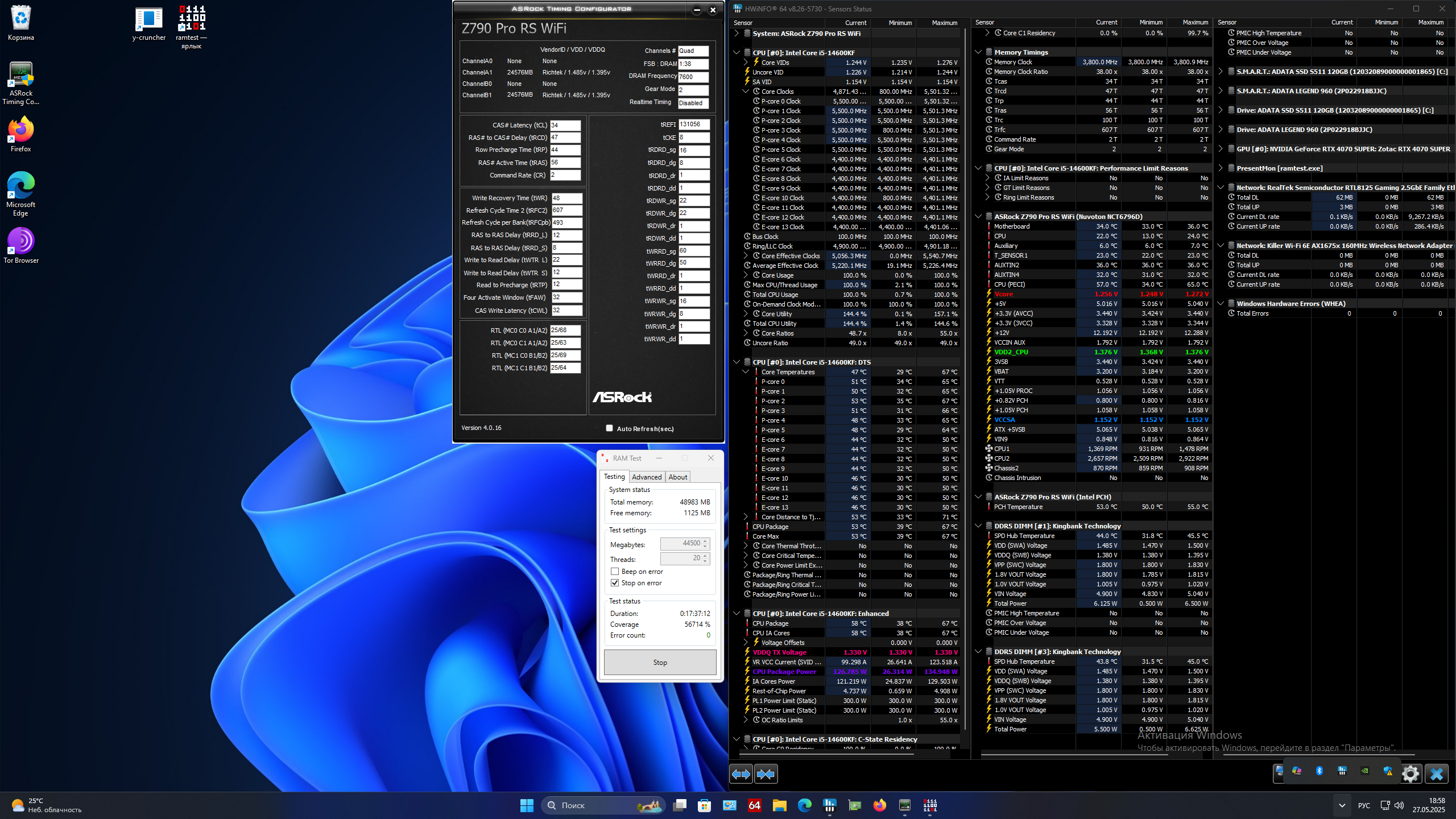 tRDRD_sg/tRDRD_dg едут без ошибок 15/7. Сейчас стоит 16/8, нейросеть советует оставить. tWR без ошибок 12, сейчас стоит 24, советует оставить. tFAW 16 без ошибок, сейчас стоит 32, советует оставить. tRTP 11 без ошибок, сейчас стоит 14, советует оставить.