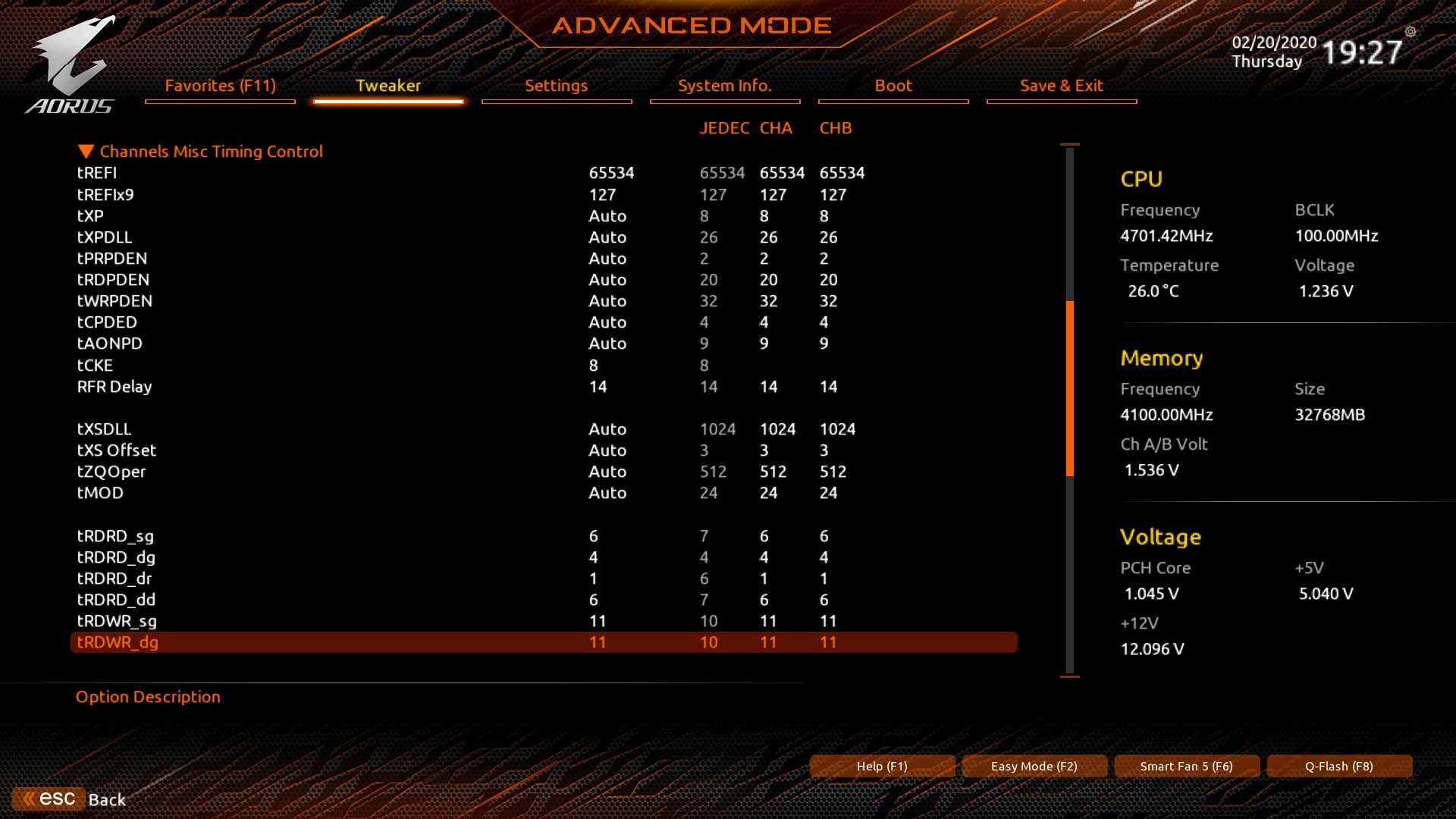 tRDPDEN = tCL + 5 = 15+5=20, как и стоит в авто режиме, значит, могу зафиксировать его. tWRPDEN, как я понимаю, равен tWRPRE, стоит также 32 как и tWRPRE, значит, также могу зафиксировать его.