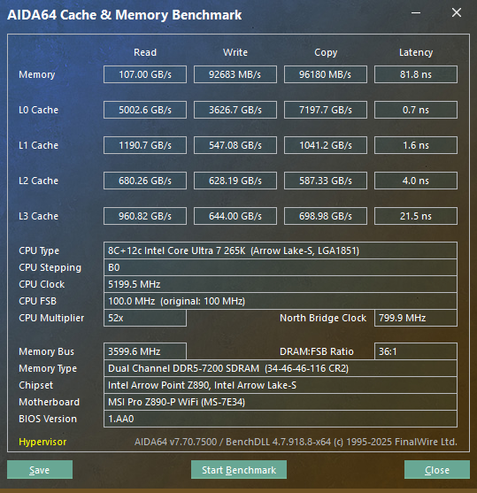 Задержка памяти ожидаемо для Arrow Lake-поколения большая (81.8 нс).