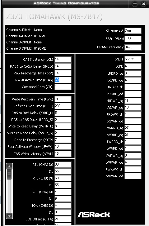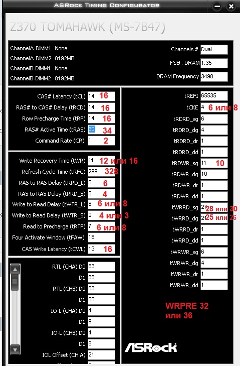 tRASmin=tCL+tRCD+2 WTRS/L устанавливаются в биосе через WRRDdg/sg согласно формуле: WRRD_sg=6+CWL+WTR_L WRRD_dg=6+CWL+WTR_S WR - через WRPRE (для матплат ASUS): WRPRE=4+CWL+WR RTP - через RDPRE (для матплат ASUS) RDPRE=RTP