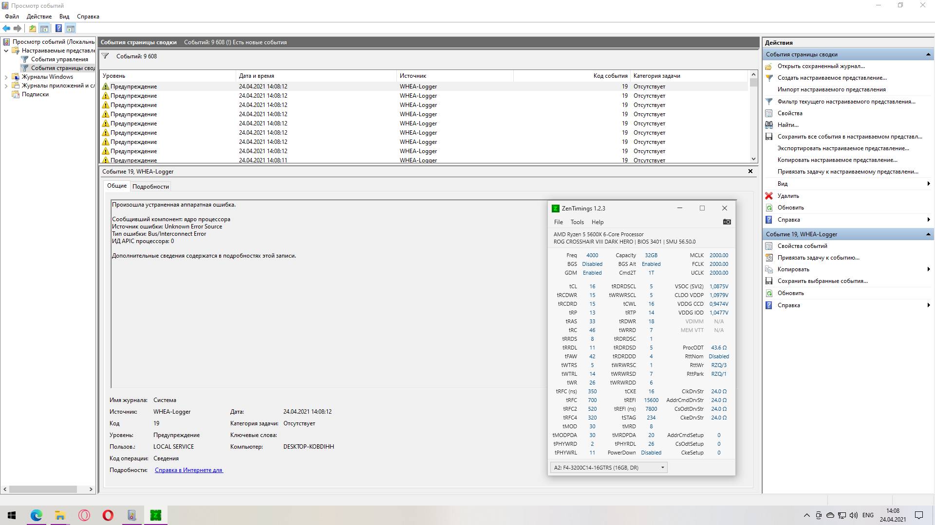 Некоторое время назад я отписывался в соседней теме о приобретении F4-4000C15D-16GVK (4x8) и F4-3200C14D-32GTRS (2x16). Для начала занялся разгоном второго комплекта и решил попробовать IF2000. На удивление без проблем запустилось (на IF2033 система уже не стартует), настроил первичные тайминги, прогнал TestMem5 0.12 1usmus V3 - ошибок нет, более тяжёлые тесты пока не делал. И тут решил заглянуть в журнал событий Windows, а там в разделе предупреждения WHEA Logger практически каждую минуту сигнализирует о том, что "Произошла устраненная аппаратная ошибка", код события 19. Синих экранов с WHEA при этом ни разу не ловил. Кто-нибудь знает насколько это критично, стоит ли дальше тратить время на настройку вторичек или с большой вероятностью Prime95 или OCCT выбьют синий экран и надо снижать частоту IF?