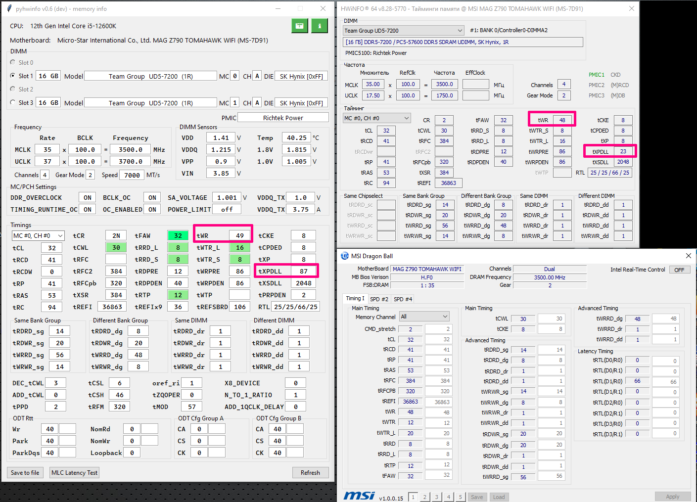 Привет, подскажите, а какой Hynix тут стоит? Обновлял платформу в прошлом году, но руки так и не дошли до памяти. Работает уже год на XMP. Теперь вот взял новую видяху и решил память покрутить заодно. Полное название T-Force Delta RGB 32GB 7000MHz CL34 (34-42-42-84) 2x16 ГБ (FF3D532G7000HC34ADC01). Скрин из HWINFO под спойлером. Если вдруг у кого похожий конфиг с той же памятью, буду благодарен за скрин, чтобы было от чего отталкиваться
