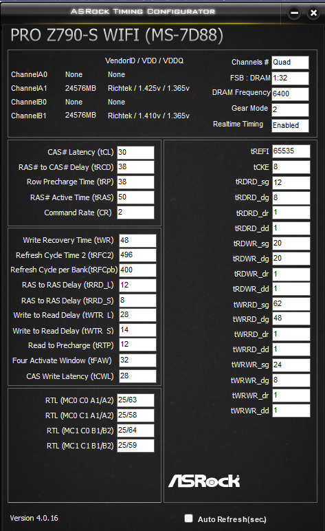 а с одной планкой экспериментил в частотные возможности слотов(+проца)? а по шине ? банально идёт полусброс в дефолт при выставлении 8000? у меня(на гиге+12700kf+2х24GB_Kingbank-6000CL28): 1/ в первом слоте - 7800 заводится далее по шине 7800@101.9=+-7950/ 8000 не заводится 2/ во втором слоте - заводится 7600/ все что выше(7733/7800) полусбрасывает биос/ по шине 7600@101.75 заводится и далее 101.8(9) полусброс биоса. 3/ при памяти в обоих слотах 7800 заводится(8000-нет), безошибочности нет(не говоря уже о всяких VST&co) 4/ в итоге - 7600 и является стабом в двуканале. может конечно, какие-то ухищрения и поменяют эту ситуацию, но, пока так.