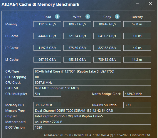 Делал практически так же: 7200 32-42-42-54 CA1.3/TX1.35/VDD2 1.4. Только напряжение на память разницу -0.6 ставил, при VDD1.5/VDDQ1.44, крашится сразу. Даже напряжение на проц повышал с 1.200 до 1.285, нет эфекта. Завелась только на 7200 32-44-44-56, CA1.100/TX1.180/VDD21.340 1.480-1.180, в сравнении с 34-44-44-56 особого прироста нет. CL получается особого прироста не даёт, вот более низкие RCD/RP хорошо влияют на прирост в аиде. 7400 34-44-44-56 1.5/1.47 CA1.3/TX1.35/VDD2 1.4, тоже сыпанулась после часа TM5 Extreme @ anta777. У меня стабильно только: 7200 34-44-44-56 1.38/1.32 7200 32-44-44-56 1.48/1.18 7000 32-41-41-53 1.38/1.32