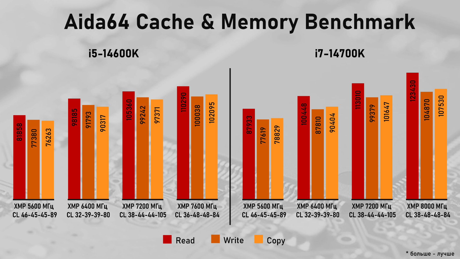 Copy немного подрос с 107 - 108.76, Latency немного увеличилась 55.4-57.9 Буду пытаться с 46 (34-46-58) на 44 (34-44-56) чтобы стабильно заработали, тогда прирост ощутимый.