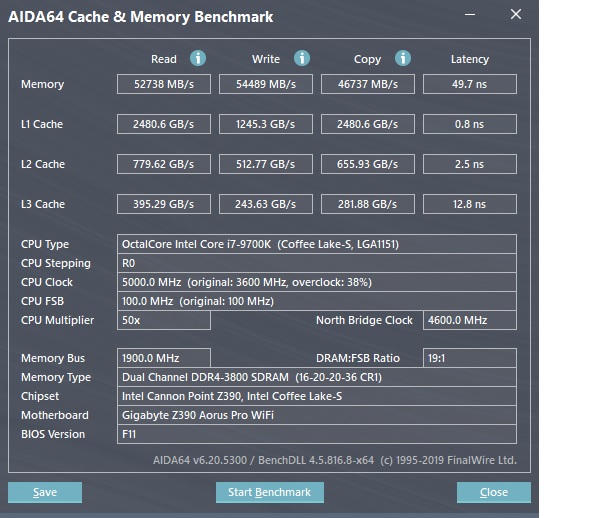 AIDA64 - не тест стабильности, надо сначала искать стабильность, а затем бенчи... Я и на з390 master 2x8 мог 4600 19-19-39, но стабильна была только 4000 16-19-39. И покажите результаты потом не на триальной версии...