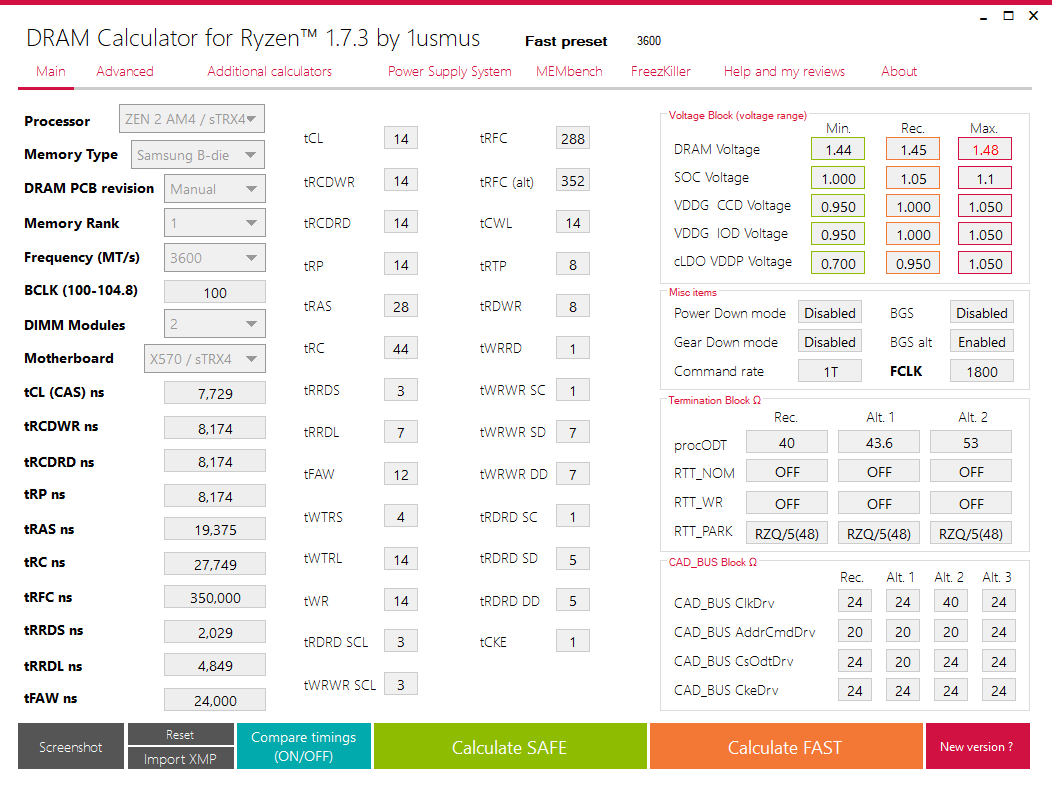 The KMS Я настраивал на 3800. Но там какая то аномалия с сопротивлениями а не с таймингами. Я весь день потратил по калькулятору выставляя все варианты возможные. Но без GDM ошибки лезут. Просто потом я ради интереса свой пресет с GDM запустил на 3600 без GDM 2Т и он работает. Либо это мать либо это память но tRCDRD 14 сразу ошибки сыпит с любым вольтажом даже на 3600. Завтра проверю для интереса на 3200. Если из тайфуна подсунуть репорт в райзен калькулятор то рисует так