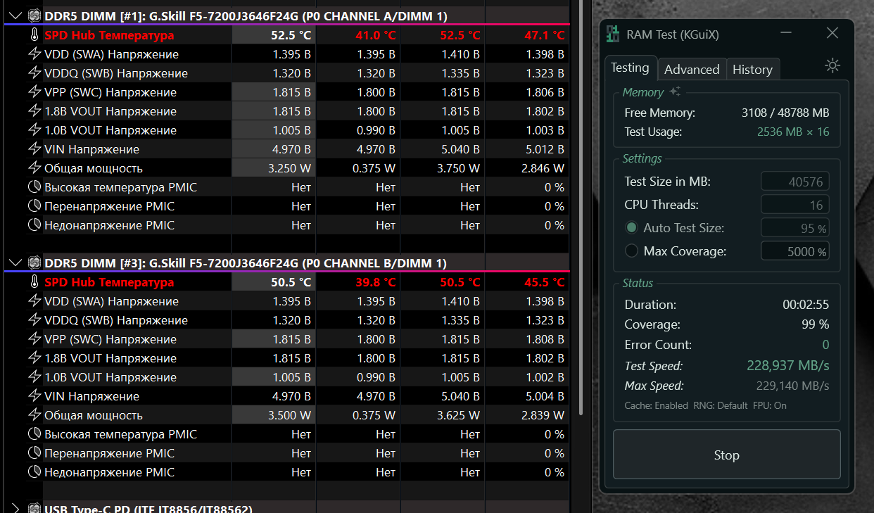 Вот прогнал до критической температуры памяти в 54*, потом будет ошибка и без обдува смысла нет дальше гонять.