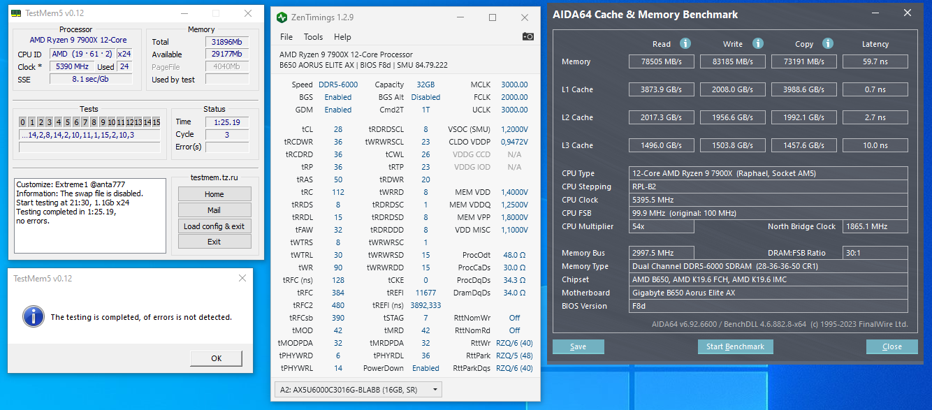 По частоте разгон, даже если поставить UCLK=MCLK/2, заканчивается на 6200. Мне кажется, тут проц ограничивает. Поэтому ограничился "родными" 6000, но выкрутил тайминги до 28-36-36-50 CR1T и tRFC384. Напряжение на памяти - 1.35 В. Температура без какого-либо обдува (на проце - СЖО) доходит до +63° C после полутора часов TestMem5 с пресетом Extreme 1 от anta777 (спасибо ему за пресет) .