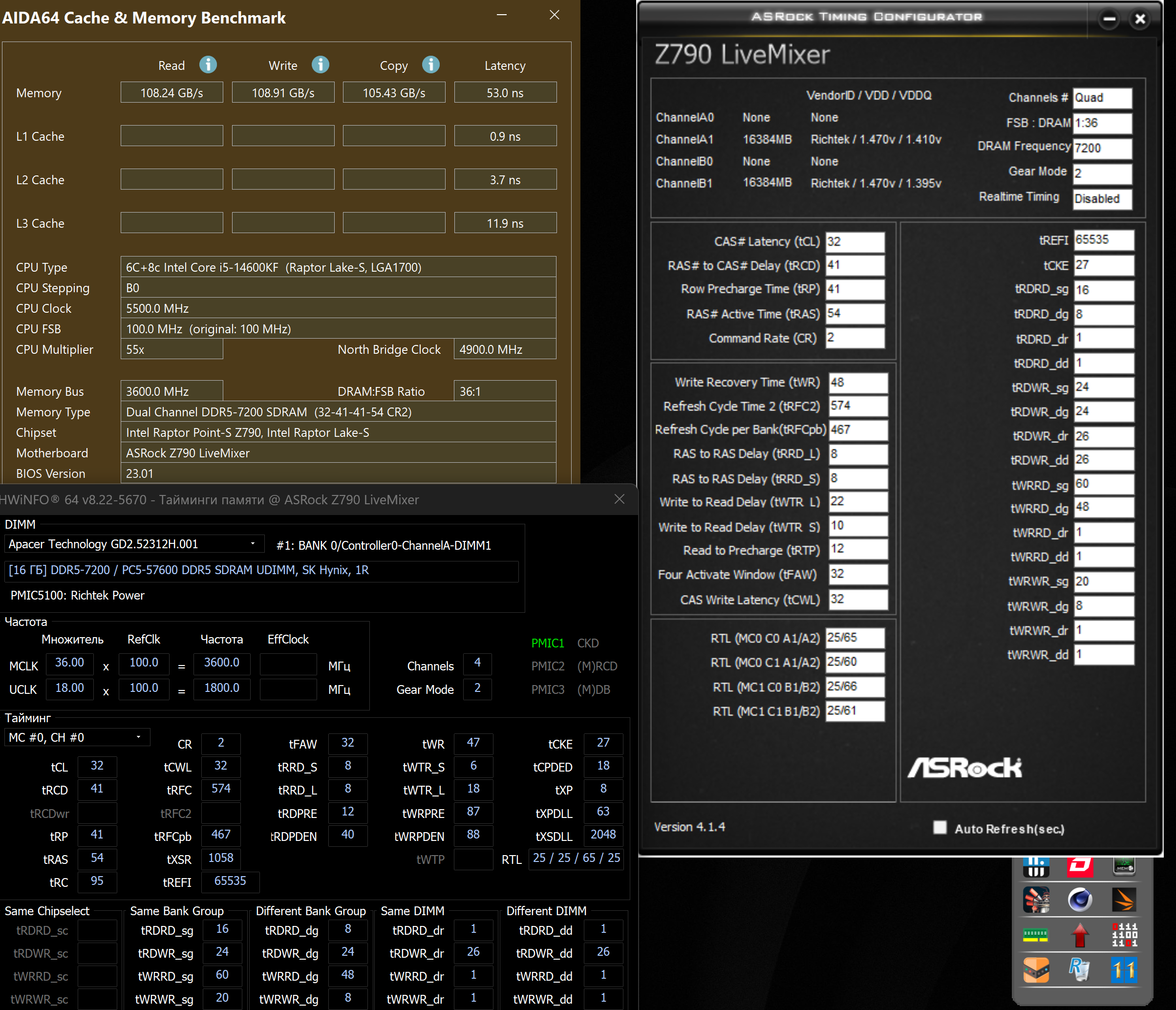 Оперативная память успешно приехала, и по тестам результат практически такой же, как и с комплектом 2×16 ГБ — разве что удалось значительно снизить напряжения до 1.25 VDD и 1.1 VDDQ, на старой при таких напругах даже винда не грузилась. Частоту 6200, похоже, уже не тянут либо процессор, либо материнская плата (скорее всего, именно процессор): на 6200 во время тестов TM5 система уходит в BSOD примерно через 15 минут. Профиль 8200 с базовыми таймингами 40-52-52-131 при 1.35 В, разумеется, даже не стартует. Максимум, что удаётся завести — 6800, но Windows при этом не загружается. На 6600 система запускается, но TM5 выдаёт ошибку практически сразу, а в AIDA скорость и задержка оказываются настолько хуже относительно 6000 с тюнеными таймингами, что смысла в такой частоте нет будь даже стаб.
