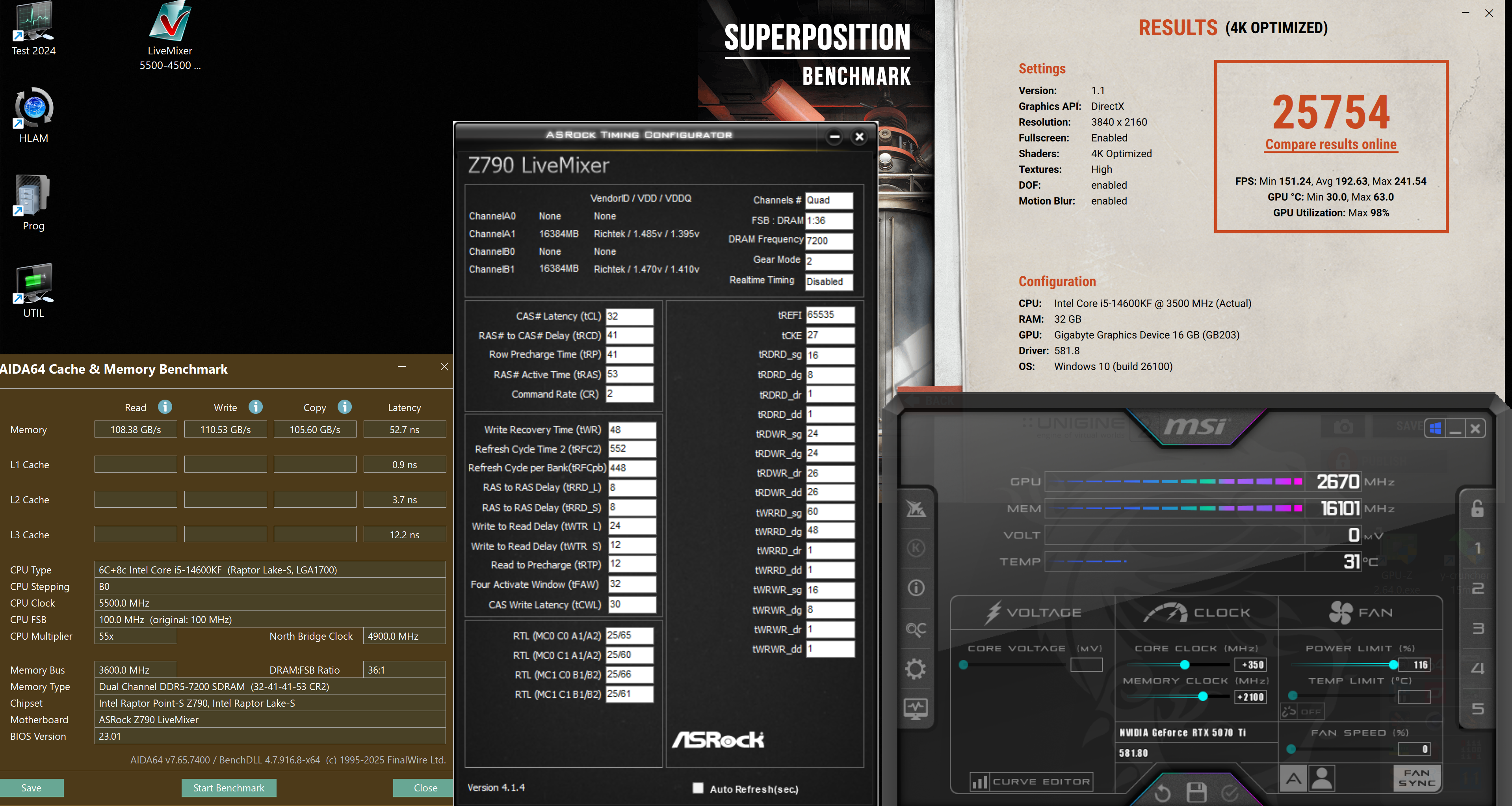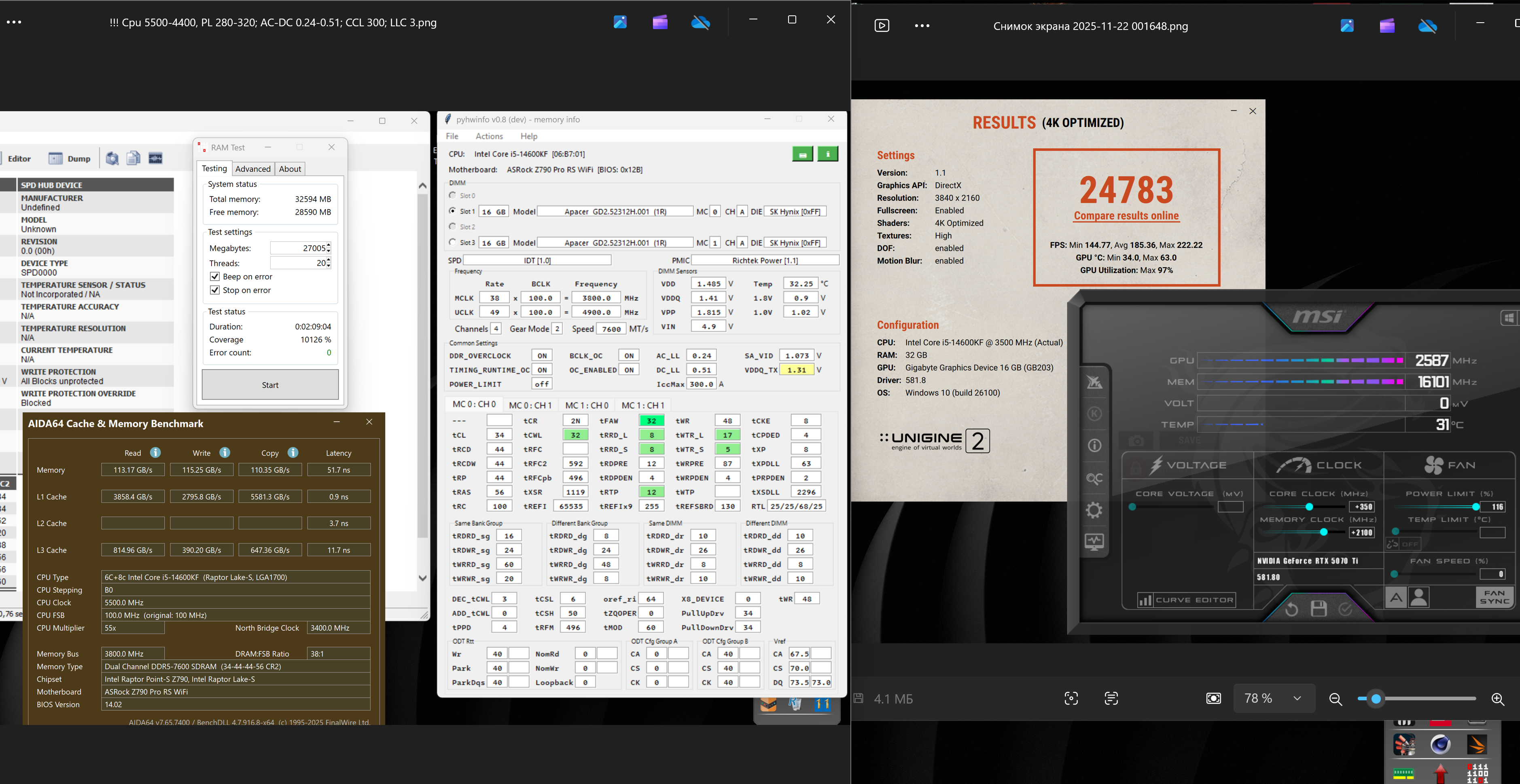 Парни зацените тему на скринах (сравните fps в SuperP). Железо и система (не переустанавливалась) везде одинаковые, дрова тоже, вк разогнана (без кривой) одним и тем же профилем, разница только: в первом случае cpu 5500\4400 LLC 3 и ddr 7600 34-44-44-56, во втором cpu 5500\4500 LLC 3.5 и ddr 7200 32-41-41-53 *скрин Аида с 7600, со старой матери ProRs, но тест делался уже на Livemixer с такими же таймингами.