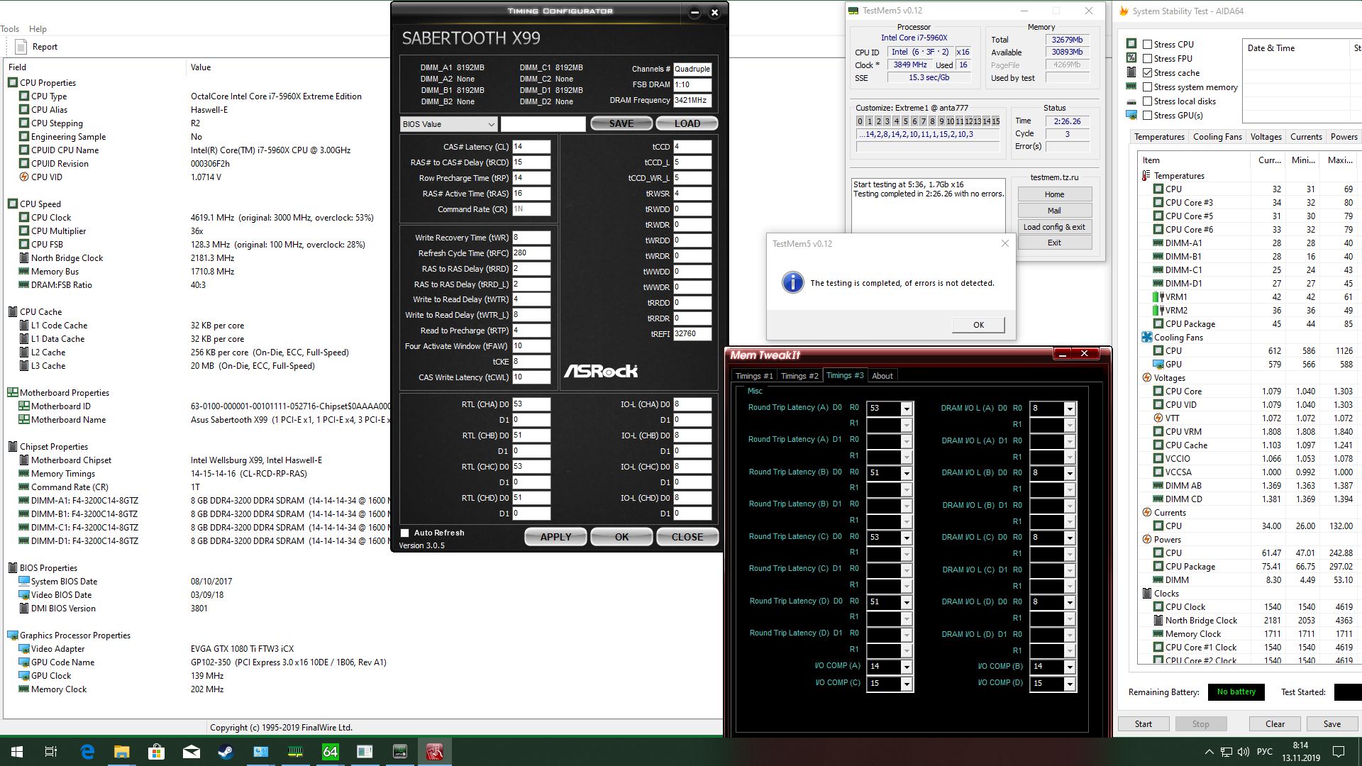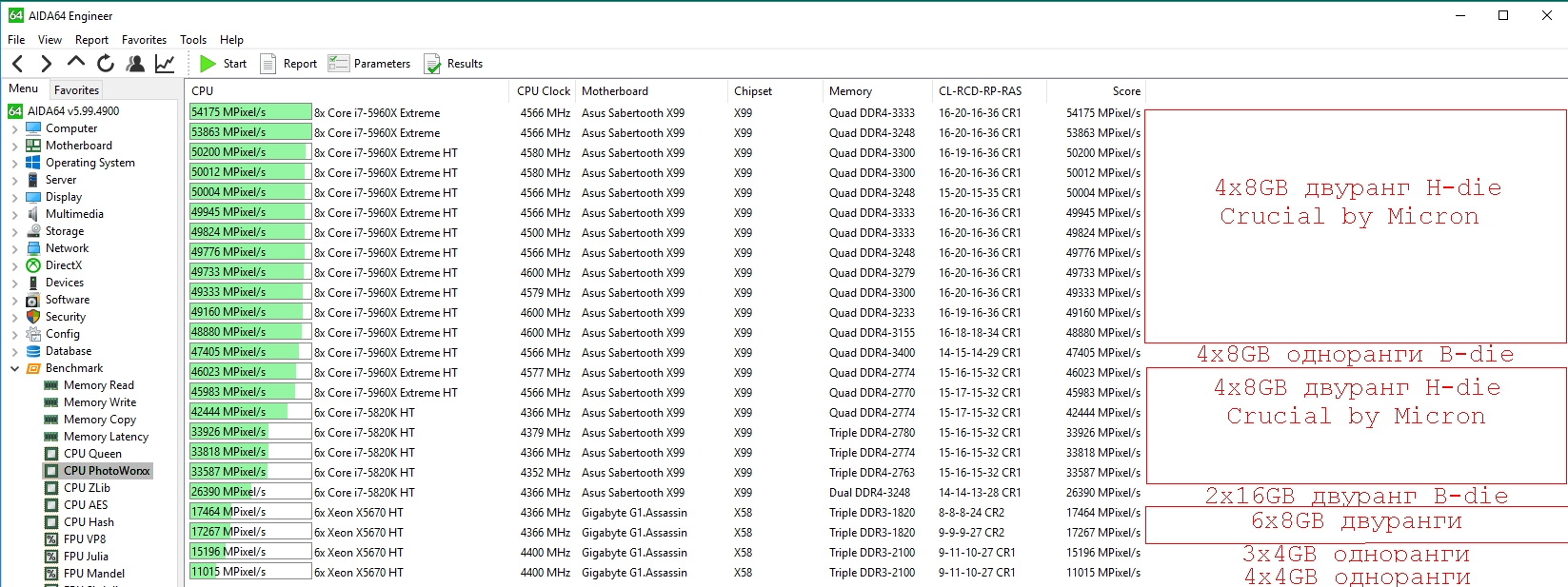 Здравствуйте уважаемые пользователи. Осваиваю просторы китайских комплектующих, в этих делах новичок. В недавнее время, в руки попал вот такой комплект, взялся за разгон памяти.. Выжать смог только 14-14-14 32 trfc-264. 2133 (максимум что может проц). в итоге результаты немного не те которые ожидались. В сравнении этого железа с похожими комплектующими других людей, результат хуже.. прикладываю скрины ниже. подскажите пожалуйста, что не так? Комплектация: atermiter x99 2660 v3 ddr4 3200 4х16, 64gb