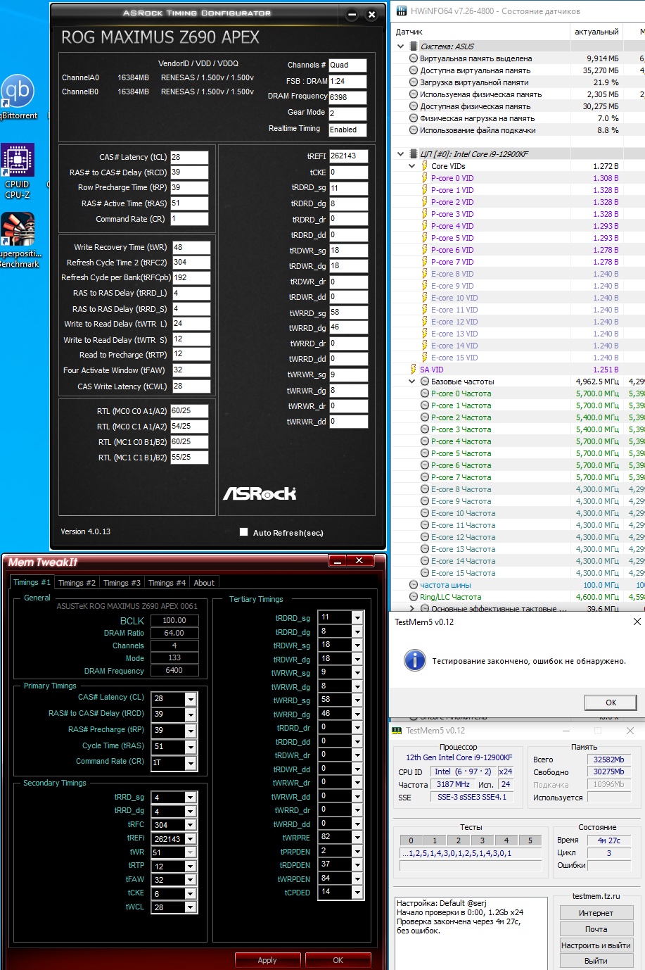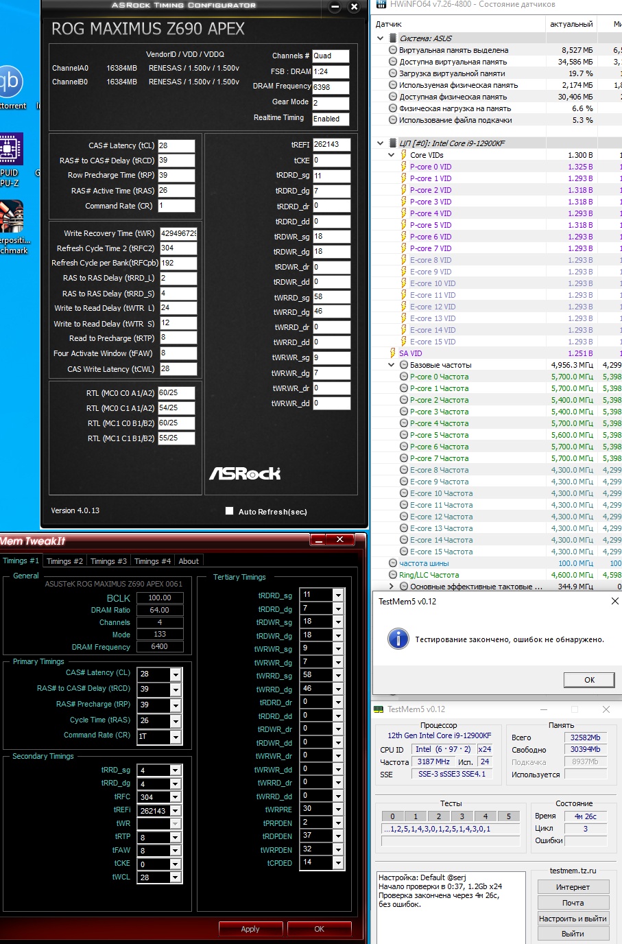Память разгонять, я, похоже, закончил. Пришёл, по сути, к варианту "Auroson1c". 6600+ 1Т уже не шло, 6933 и 7000 винду грузили, но стабильности в стрессах найти не смог. 6800 2Т ловить не стал, т.к. это одно и то же с 6400 1Т.