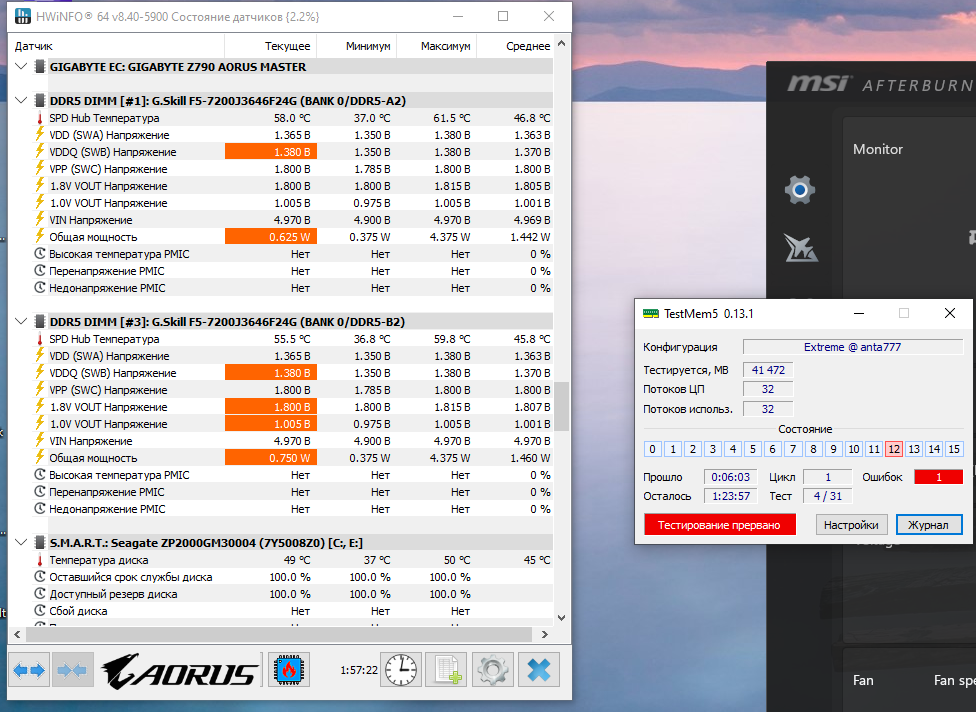 Задача - челу нужно 7200 МГц. С слов владельца с самого начала хмп профиль не берет. И при 5800 анстаб даже. Заметил что у него корпус очень неудачный под такое железо, там радиатор спереди, и в корпус ищет уже тепленький 40 градусов воздух, и еще видеокарта 2слотовая sff ready 4080s с потреблением 250-300вт, все это нагревает память аж 60 и даже на 5800 МГц память теряет стабильность. VDDQ CPU 1.3-1.4, VDDR2 CPU 1.3-1.4, vccsa 1.1-1.3 в каждом параметре с шагом на 0.05в менял, результата нет. IMC в проце плохой? Или мать рыгается? Про охлад понятно, ему донес эту мысль. Щас поставил обдув на оперативу, вроде стабильнее ищет, но имхо такое себе, а вот 7200 при Хмп не берет почему?