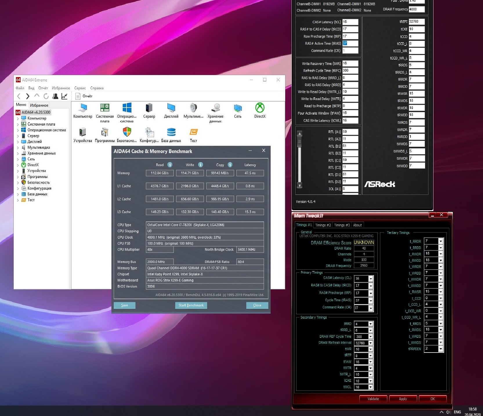 Финальный вариант на скринах. Третички вернул на авто,т.к. эффект от их снижения на моей системе близок к 0. tWTR и tWTR_L оставил на 4 и 10 соответственно. До рекомендуемых табличкой tWTR_L=8 не опускается, наглухо вешает систему и даже вход BIOS невозможен. Asrock определяет 1 канальный режим, но по факту он 4-х канальный. Еще раз огромное спасибо всем, кто пытался помочь.Отдельное спасибо anta777 за табличку.
