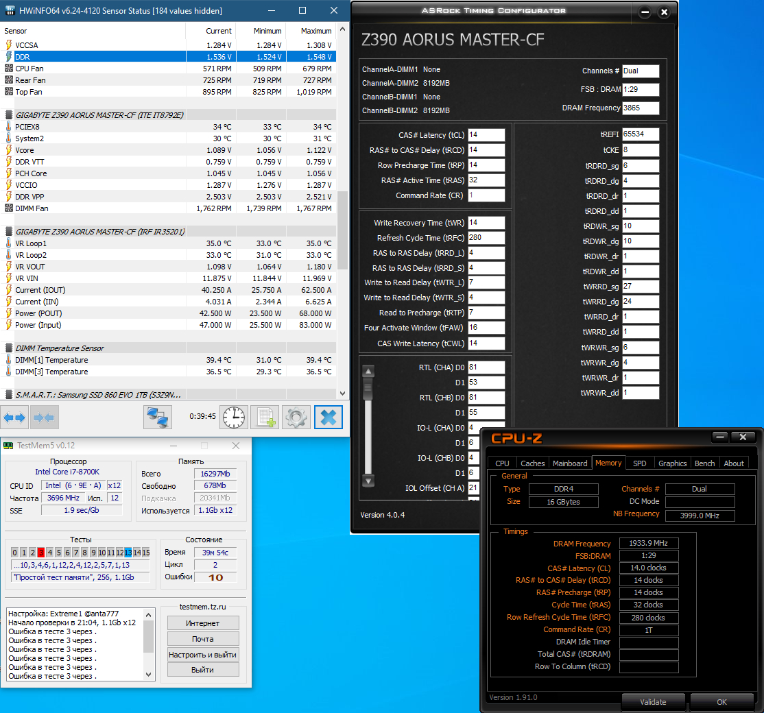 MeDd На гиге 3900 14-14 пресет, вольтаж 1.56 и вниз. Обе по раздельности могут 3900 14-14 1.54В, вместе 1.55В. Сейчас поменял местами, чтобы проверить, можно ли сделать 1.54 или ниже.