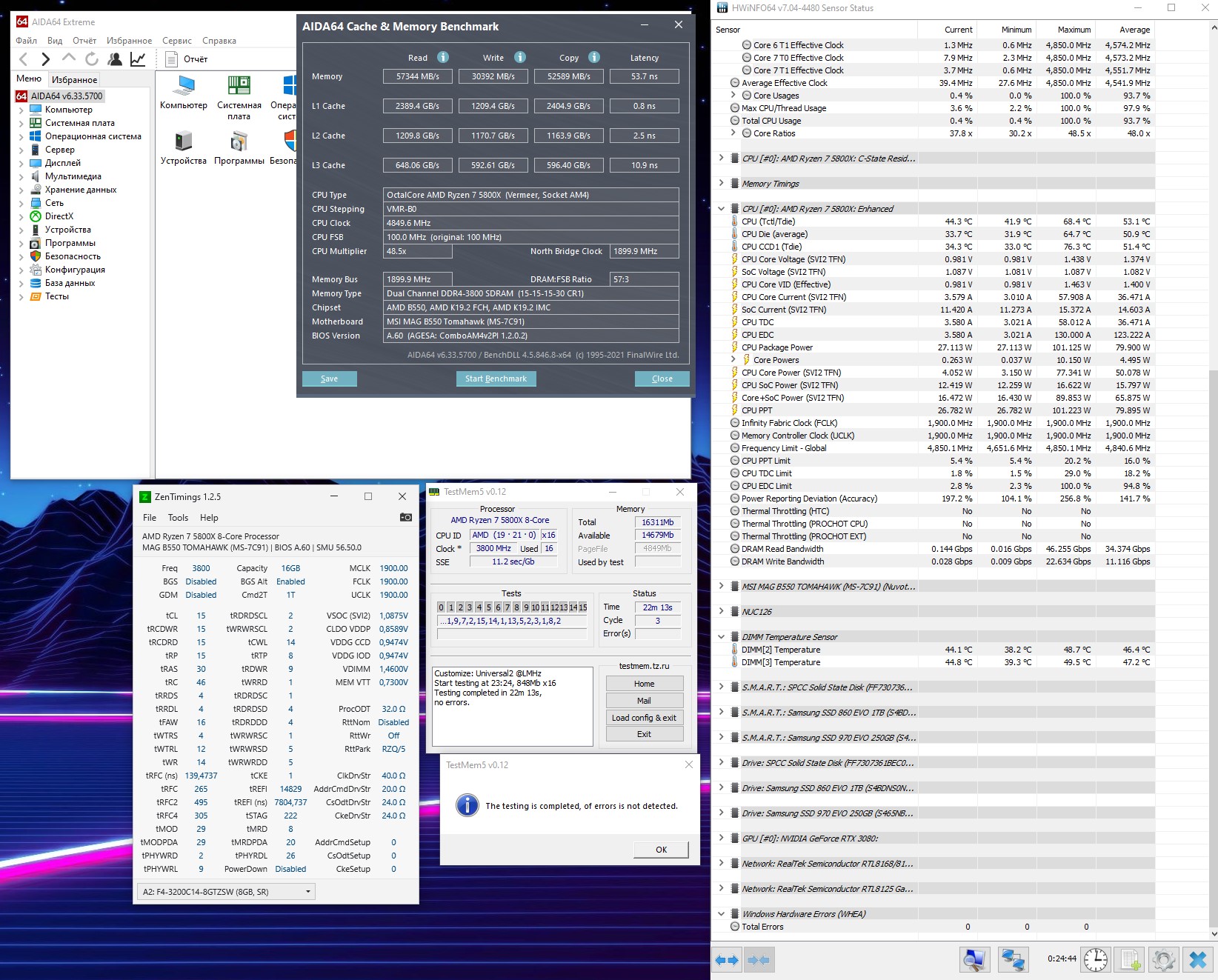 4. Перед настройкой частоты и таймингов рекомендуется установить принудительное охлаждения на модули памяти, особенно для памяти с чипами Samsung B-die, повышение температуры памяти выше 48°, может сопровождаться дополнительными ошибками, не связанными с неправильной настройкой таймингов, что затруднит их поиск и общую настройку памяти.
