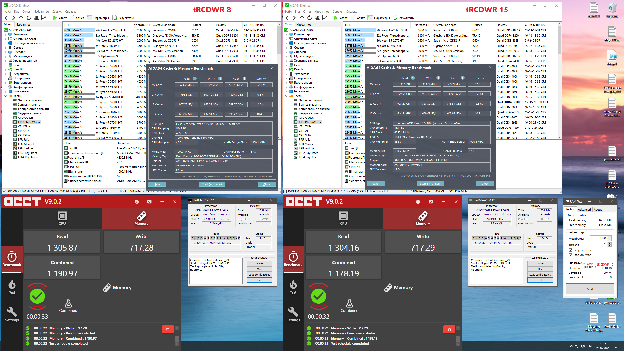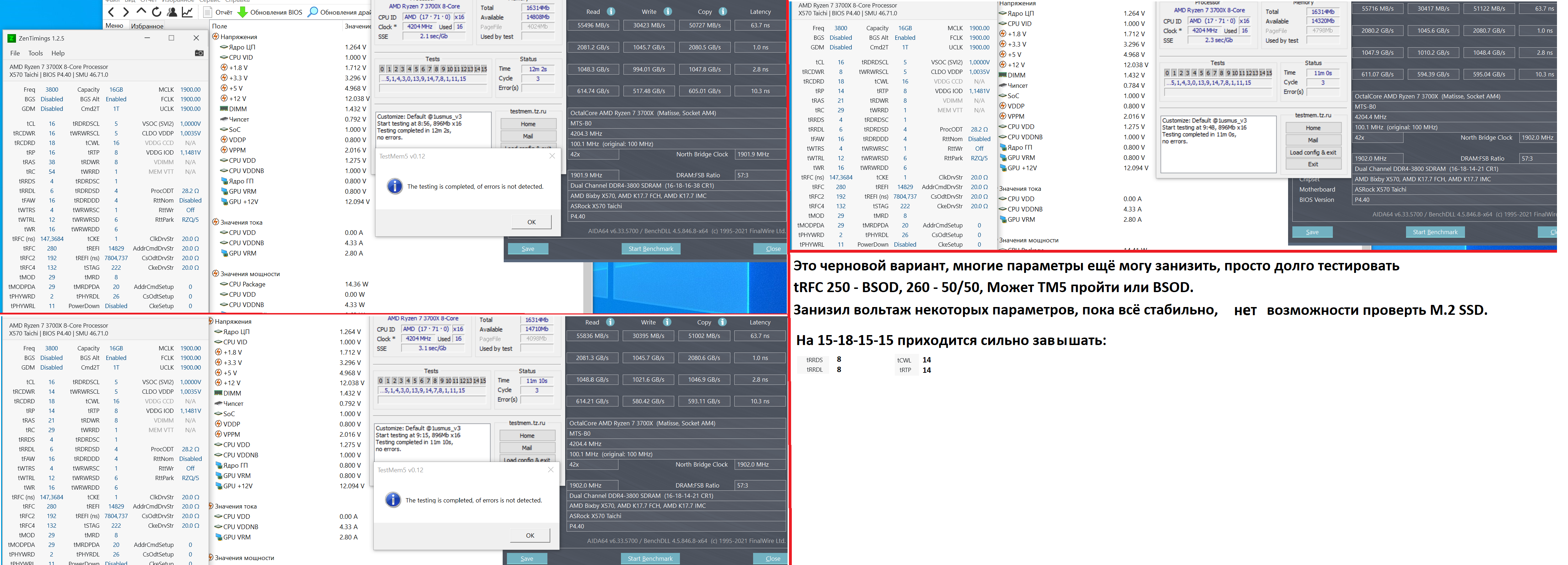 Всем привет! Что имеем в стоке: G.Skill F4-3200C16В-32GTZN 32GB 2 ranks (F4-3200C16-16GTZN х 2 на чипах Samsung B-die (Boltzmann/20 nm)/1 die) XMP 3200MHz с таймингами 16-18-18-18-38-56 1.35V Что получилось: 3600MHz с таймингами 18-19-21-19-40-64 (плюс правленные вторички) 1.368V Память в разгоне проходит тест TestMem5 на присете Extreme1@anta777 без единой ошибки так же как тесты OCCT 8.2.44.9 (как в целом системы так памяти), но есть одно НО тест памити в AIDA 64 проваливает практически сразу. Как удалось выяснить тест в AIDA проходится без проблем при напруге на пямять в 1.344V, однако в TestMem5 появляются редкие ошибки, как правило, в тесте2 (1-5 на все три цикла на присете Extreme1@anta777). В игре Ворлд оф Канистры (WOT), что в одном, что в другом случае вылетов не наблюдается, а эта "падла" очень не лояльна к неправильным настройкам ОЗУ. Вылетов из других игр, приложений пока не наблюдал... Интересно мнение разбирающихся (опытных) людей по данному поводу)). P.s. Наблюдаю ещё такую фигню: при старте системы латентность в тесте AIDA 68-69ns, а после того, как даешь нагрузку системе, к примеру после игры, латеность в тесте растёт до 65ns...