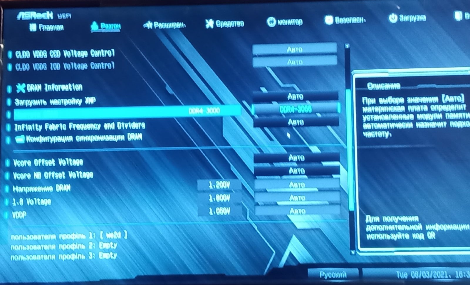 Доброго времени суток! Если кто может помогите ламеру. Это мой первый собранный самостоятельно компьютер и раньше я дел каких-то не имел с оперативкой, я даже не думал что настолько окажется всё не понятным для не подготовленного. Суть в том что в марте-апреле собрал компьютер и тестил его, увидел что не берёт система никак 3200 заявленные на коробке памяти и чудным образом проблема сама исчезла, недавно чистил комп и как-то даже не обращал внимания на частоту оперативы, сегодня глянул а там 2600 её стандартные из коробки, пол дня пытался как-то это решить ничего не помогло. Пытался пошагово выискивать частоту которую система берёт и понял что это 3060, начиная с 3130 комп включается проходит 2-3 секунды он резко вырубается и так три раза, потом комп врубается и ставит коробочную частоту 2600. При попытке поставить XMP профиль вольтаж загорается красным цветом и появляется значение 1.350 (стандартно там указано 1.2) И такая же ситуация как с частотой 3130 три раза перезагрузка и сброс до 2600. Я ВООБЩЕ ПОЛНЫЙ НОЛЬ в памяти, ничего не знаю про неё и поэтому испробовав что-то прочесть или посмотреть видео я всё таки решил попросить помощь так как есть опасения что если полезу без совета то сделаю хуже. Скриншот из программы ZenTimings