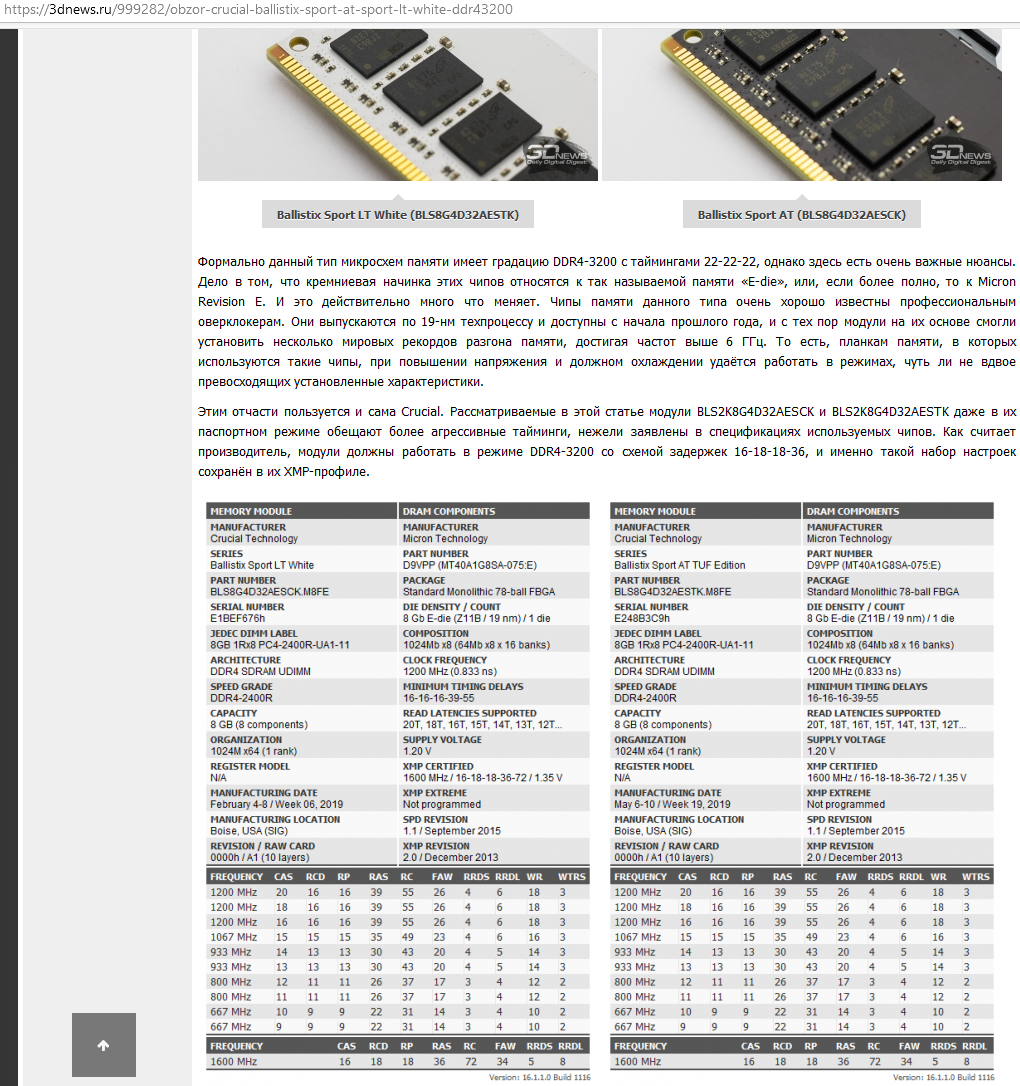 С разгоном 3800-4000 Мгц CL16 на Intel и с ценником -20% от Samsung B-die, то ваш вариант Micron E-die / B-die. Ценник 5,5-7 тыс. рублей за 2x8 Gb, 12-13 тыс. рублей за 2x16 Gb и 24-26 тыс. рублей за 2x32 Gb. E-die 2x8 Gb Берем любые Crucial Ballistix с профилем XMP 3000 CL15, 3200 CL16 и 3600 CL16 маркировка (комплект): BL2K8G30C15U4, BL2K8G32C16U4 или BL2K8G36C16U4 маркировка (поштучно): BL8G30C15U4, BL8G32C16U4 и BL8G36C16U4 (главное, чтобы в маркировке присутствовало U4, последние буквы означают цвет радиаторов) например: BL2K8G30C15U4WL BL2K8G30C15U4B BL2K8G30C15U4BL BL2K8G30C15U4RL BL2K8G32C16U4B BL2K8G32C16U4BL BL2K8G36C16U4R BL2K8G36C16U4W