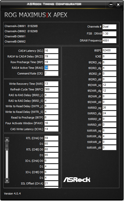 Начните с RCD, CL. Не обязательно должны быть одинаковыми, обычно CL идёт меньше чем RCD. RAS сразу пробуйте как RCD+CL+4, до этого значения от него существенная разница, дальше меньше. CWL<=CL. Допустимые значения 9,10,11,12,14,16,18,20. RP можете выставить по RCD, если пойдёт меньше - тоже неплохо, не уверен правда насчёт смысла. RTP без формул. Если не идёт вниз можно попробовать поднять чуть чуть RP. В DDR4 явно связан с WR соотношением 2 к 1 (например WR20\RTP10), физически хранится одно значения и в зависимости от операции интерпретируется. Скрутите FAW до 16(так и оставьте если работает). С таким FAW скручивайте RRD(оба, L обычно больше чем S), возможно поедут на 4 оба. Если до 4 не удалось спустить поднимите FAW до уровня RRDL*4 и попробуйте ещё, хотя это скорее всего уже почти предел. Обычно L>=S. L - SG(Same Group). S - DG(Different Group) Напр. RRD_L>=RRD_S. CKE=5 СCDL>=4 RDRD_DD и прочие подобные можно проигнорировать если у вас нет двух планок на один канал (4 планки). DD-Different Dimm. Тоже самое с DR-Different Rank если у вас одноранговая память. RDWR_SG(DG) и подобные сочетания скручивайте до минимальных рабочих, потом накиньте сверху +2. Как уже отметил обычно SG>=DG. WTR не трогайте он сам спустится когда будете скидывать WRRD_SG(DG) и прочие подобные. Если сам меньше не стал тогда руками скидывать. WR снижать через WRPRE если есть. Если нет или не снижает WR, То скрутите его скажем до 12 или +4 от рабочего, потом дожмёте если не лень будет. RFC явных формул нет, крутить после всего списка сверху. Не пытайтесь найти его минимальное значение если не хотите чтобы память начинала сыпать ошибками от любого чиха. найдите пограничное со стабильностью значение и накиньте сверху 20 или сразу 40. Может реагировать на RAS+RP, RRD, FAW, причём в обе стороны (то есть может "сломаться" если задрать названные), а может и не реагировать... REFi больше лучше. Связан с RFC. REFI сколько память "работает" - RFC сколько "отдыхает". Оба тайминга лучше не пытаться найти предельное значение.Заметно реагируют на температуру. Многие тайминги отзываются и на температуру и на напряжение. Поскольку напряжение может как позволить снизить тайминг, так и увеличить температуру, то середину можно искать очень долго, поэтому лучше бы вовремя остановится. Тестируйте тщательно с перезагрузками, сном, холодным стартом. RTL и IOL вам кто-то другой пусть советует как настраивать, от них у меня голова болеть начинает...