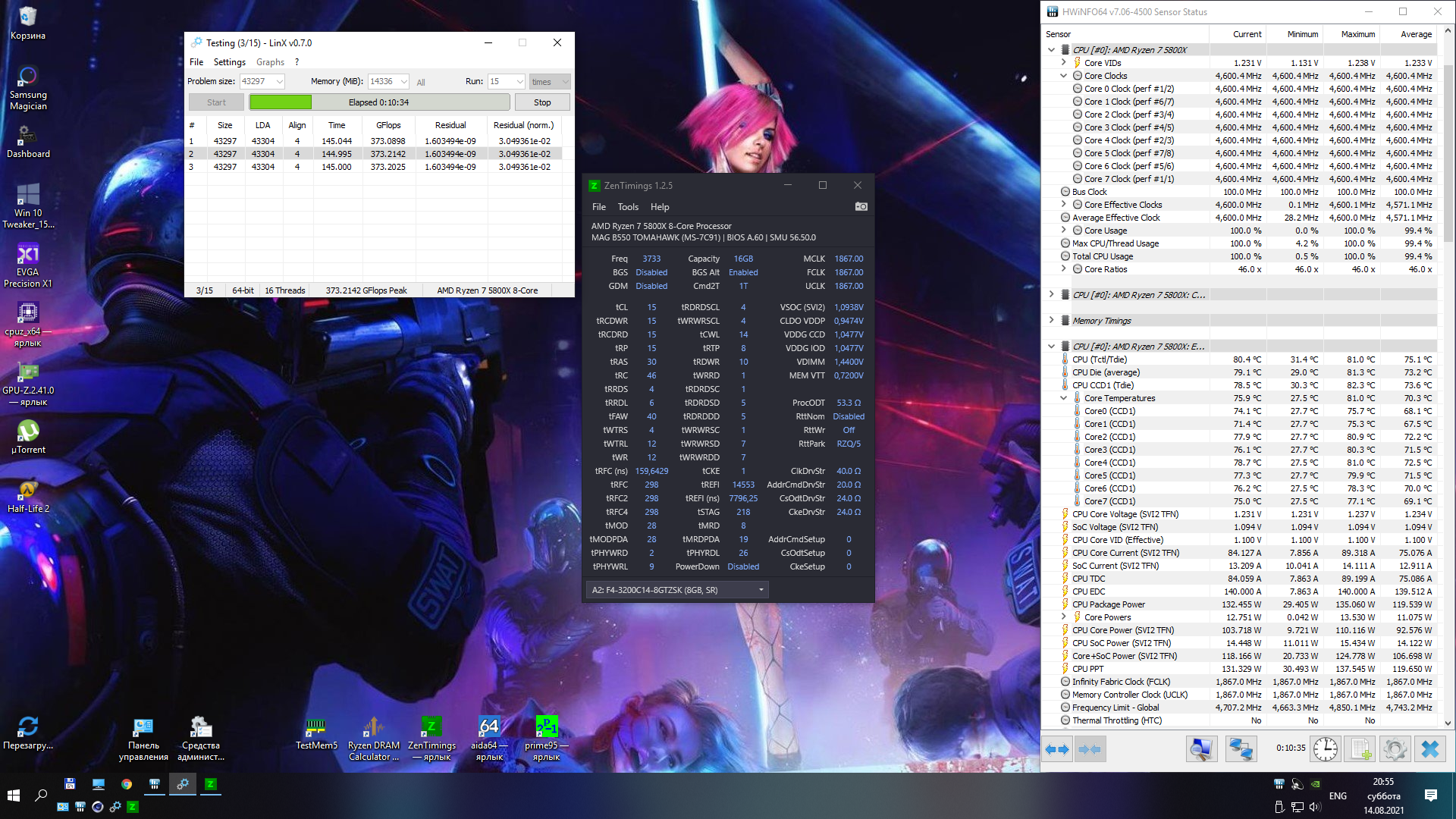 tFAW и температура ZEN3. На днях обновился с 3600x до 5800x. Ядра зафиксил на 4600MHz/1.235V. Завел тачку с XMP 3200 - макс температура ~83C в LinX. Решил выставить тайминги из "калькулятора" и температура взлетела до ~105 сразу после заполнения памяти(размер 14336), т.е. при активной загрузки ядер. С Праймом +- одинаковая ситуация. В последующем нашел виновника - tFAW. Изменение с "Auto" на фикс 16 - дает жару) В связи с этим, собсно, вопрос. [size=85]Даже не знаю как сформулировать.[size=85] Что это за "супер" тайминг, какую такую роль он играет и "из-за чего" такой резкий скачок температуры.. Сравнить результаты смог в AIDA и 7-zip/(что-то серьезнее не могу из-за 105C)/ В AIDA на уровне погрешностей, 7-zip прирост как-бы есть при tFAW16, но мизерный и не соизмерим с приростом темпы. Проблемы вроде как-бы и нет - все-равно охлад менять, но интерес к этому tFAW теперь очень неподдельный)