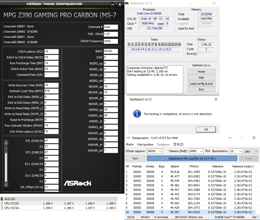 anta777 Подскажите, может ли быть такое, что повышенные sa/io это плата за WPRE/RPRE=1, ccdl/s=6/4, rdwr/dg=10? Сейчас такие показатели на постоянку. Раньше было rrdl/s стояли 4ки (и была полная стабильность, и в играх на ультрах), ослабил до rrdl=6, остальные старые значения оставил. Прошивку апнул с 1.50 до 1.60 - получилось sa/io спустить, всего лишь с 1.23/1.2 до 1.2/1.18 (по биосу, не по прогам), но все равно высокие для частоты в 3600, судя по этой ветке обсуждения. Проц в стоке, но когда проверял линксом (40000 задачей) его разгон, sa/io пришлось еще сильнее повысить, чтобы пройти линкс, и это всего-лишь 4700/4400, avx=auto, 1.37цп, ddr4=1.42. Пока не сменил моник, проц будет в стоке на данный момент времени. Хотелось бы поинтересоваться, есть ли смысл ослаблять тайминги для снижения sa/io или это КП камня не дает нужные результаты напруг? зы, кто-то писал про - что на время линкса не врубать аиды или HWiNFO64, не уверен, что в них дело, когда тестил.