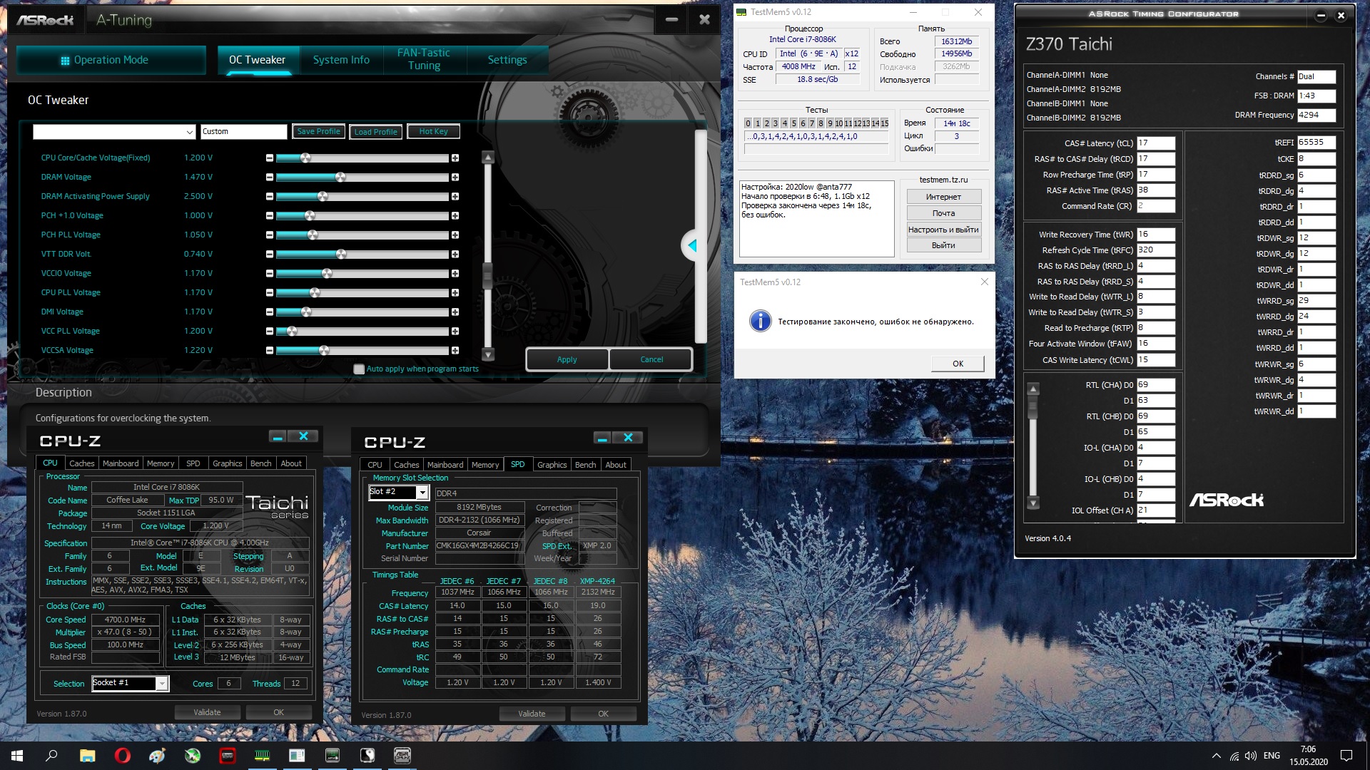 С разгоном памяти 3900 МГЦ 16-21-21-41 CR1 продержался без ошибок 52 минуты в ТМ5 экстрим (200% - 2 цикла) и 67 минут в стандартном ТМ5, но у меня плата всё равно не стартует, если включить MCH Full Check [Enabled], то есть даже в биос зайти нельзя, приходится выключать и включать комп. На меньших частотах с пережатыми таймингами и включенным MCH Full Check плата спокойно стартует, но бывает, не то что в стандартном ТМ5 ошибки на первых секундах, а даже синий экран вместо рабочего стола, то есть винду не грузит. Есть у кого-нить догадки, что происходит?