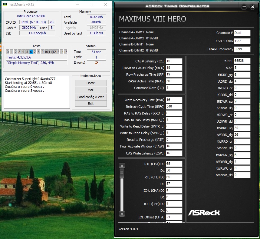 Весь комп замучил перезагрузками, подбирая тайминги, пока не понял, что tREFI больше 60120 не идёт без ошибок на этой частоте с CR1. tREFI 65520 - единичные ошибки в простом тесте, а затем целая куча на первом зеркальном сдвиге. tREFI 61200 - единичные ошибки на зеркальном сдвиге после 10 минут теста. Настройки ТМ5: Time (%)=200, Cycles=6, Reserved Memory for Windows (Mb)=512 Trace Centering выключен, его включение никак не влияет на мою память, уже много раз включал и выключал туда сюда.