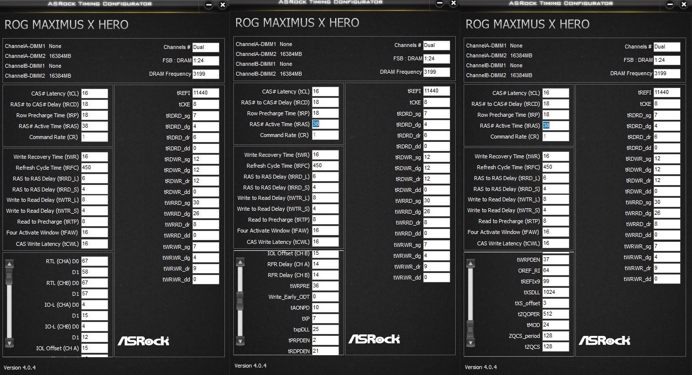 Начните с RCD, CL. Не обязательно должны быть одинаковыми, обычно CL идёт меньше чем RCD. RAS сразу пробуйте как RCD+CL+4, до этого значения от него существенная разница, дальше меньше. CWL<=CL. Допустимые значения 9,10,11,12,14,16,18,20. RP можете выставить по RCD, если пойдёт меньше - тоже неплохо, не уверен правда насчёт смысла. RTP без формул. Если не идёт вниз можно попробовать поднять чуть чуть RP. В DDR4 явно связан с WR соотношением 2 к 1 (например WR20\RTP10), физически хранится одно значения и в зависимости от операции интерпретируется. Скрутите FAW до 16(так и оставьте если работает). С таким FAW скручивайте RRD(оба, L обычно больше чем S), возможно поедут на 4 оба. Если до 4 не удалось спустить поднимите FAW до уровня RRDL*4 и попробуйте ещё, хотя это скорее всего уже почти предел. Обычно L>=S. L - SG(Same Group). S - DG(Different Group) Напр. RRD_L>=RRD_S. CKE=5 СCDL>=4 RDRD_DD и прочие подобные можно проигнорировать если у вас нет двух планок на один канал (4 планки). DD-Different Dimm. Тоже самое с DR-Different Rank если у вас одноранговая память. RDWR_SG(DG) и подобные сочетания скручивайте до минимальных рабочих, потом накиньте сверху +2. Как уже отметил обычно SG>=DG. WTR не трогайте он сам спустится когда будете скидывать WRRD_SG(DG) и прочие подобные. Если сам меньше не стал тогда руками скидывать. WR снижать через WRPRE если есть. Если нет или не снижает WR, То скрутите его скажем до 12 или +4 от рабочего, потом дожмёте если не лень будет. RFC явных формул нет, крутить после всего списка сверху. Не пытайтесь найти его минимальное значение если не хотите чтобы память начинала сыпать ошибками от любого чиха. найдите пограничное со стабильностью значение и накиньте сверху 20 или сразу 40. Может реагировать на RAS+RP, RRD, FAW, причём в обе стороны (то есть может "сломаться" если задрать названные), а может и не реагировать... REFi больше лучше. Связан с RFC. REFI сколько память "работает" - RFC сколько "отдыхает". Оба тайминга лучше не пытаться найти предельное значение.Заметно реагируют на температуру. Многие тайминги отзываются и на температуру и на напряжение. Поскольку напряжение может как позволить снизить тайминг, так и увеличить температуру, то середину можно искать очень долго, поэтому лучше бы вовремя остановится. Тестируйте тщательно с перезагрузками, сном, холодным стартом. RTL и IOL вам кто-то другой пусть советует как настраивать, от них у меня голова болеть начинает...