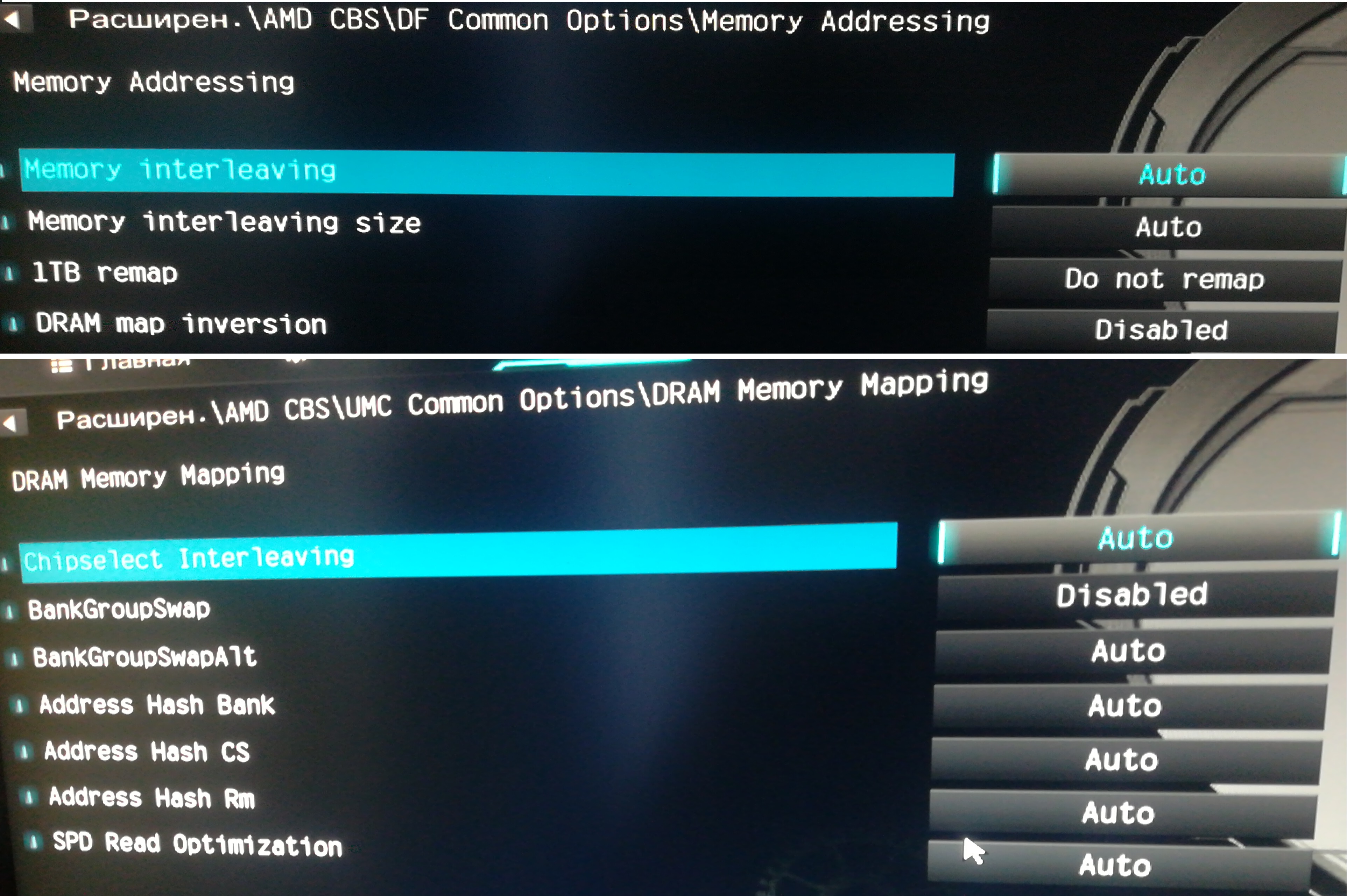 Memory interleaving выкл - TM5 проходит на 1 минуту 46 секунд дольше, в Аида64 чтение -8000, копирование -6000. 1 TB remap и DRAM map inversion выкл - ускорили прохождение TM5 на 6 секунд.