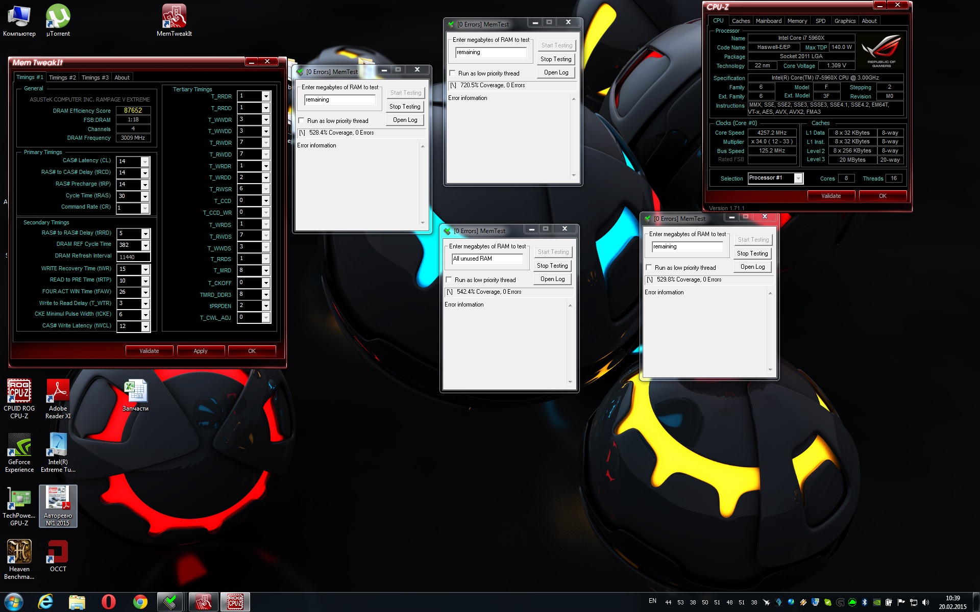 Ded_Pybanok Crucial DDR4-2133 16GB(4x4) CT4K4G4DFS8213 @ 2400 11-11-11-27-243-1T 1.35V (на 1.3V не стартует, на 1.32V не стабильна) #77 Гнал так: Загрузил профиль памяти 1866Мгц в биосе, поднял частоту до 2400, а тайминги снизил до 11-11-11-27-1Т Пробовал так же сделать на 1600 профиле, но ошибки. Видимо из-за tRFC на 204 против 243 Тестировал memtest@12 копий@каждая копия по 1200мб. Итого 14.4\15.9ГБ доступных в винде. Загрузка ЦП была 100% всех ядер. Около 1.5 часа.